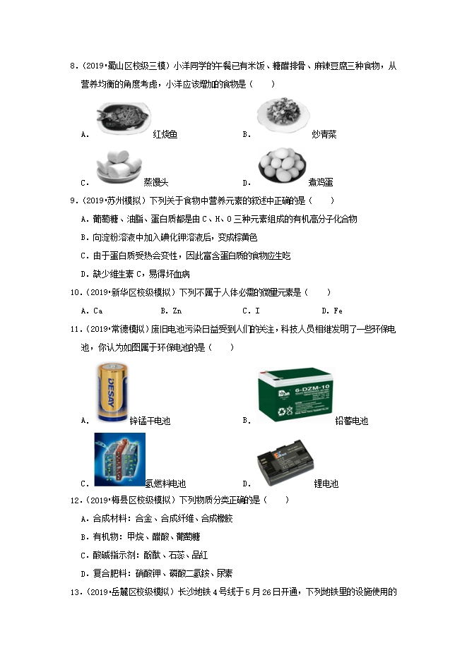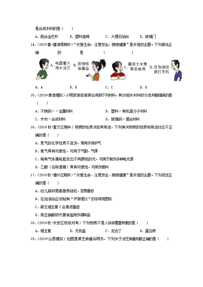 【内容简介】被誉为“智力之源”,缺乏会造成小儿侏儒症、发育迟缓的元素是( )A.铁元素B.碘元素C.锌元素D.钙元素2.(2019•揭阳二模)下列说法正确的是( )A.人体中的元素除 C、H、O、N 外,其他元素主要以无机盐形式存在水溶液B.二氧化碳能使干燥的紫色纸花(浸石蕊试液后晾干)变红色C.水银温度计测体温时水银柱上升,是由于汞原子体积变大D.压缩天然气可用 LPG 表示3.(2019•曲靖模拟)以下属于可再生资源的是( )A.石油B.铁矿C.风能D.天然气4.(2019•溧水区校级模拟)下列物质属于复合材料的是( )A.电木B.钛合金C.羊毛D.玻璃钢5.(2019•百色中考)习总书记在全国生态环境保护大会上指岀要像保护眼睛一样保护生态环境,像对待生命一样对待生态环境。下列选项中,不利于生态环境保护的是( )A.参与植树造林,扩大植被面积B.改进污水处理技术,减少水体污染C.使用一些新型可降解的塑料,减少“白色污染”D.将校园散落的塑料袋、树叶集中焚烧,保持整洁的环境6.(2019•陆良县模拟)下列说法错误的是( )A.做饭时,若燃气灶的火焰呈现黄色,锅底出现黑色,则需要调大灶具的进风口B.区分羊毛和蚕丝可灼烧闻气味C.铵态氮肥不能与碱性物质混合施用会降低肥效D.图书档案着火,可用二氧化碳灭火器灭火7.(2019•深圳模拟)下列有关材料的说法中错误的是( ).......