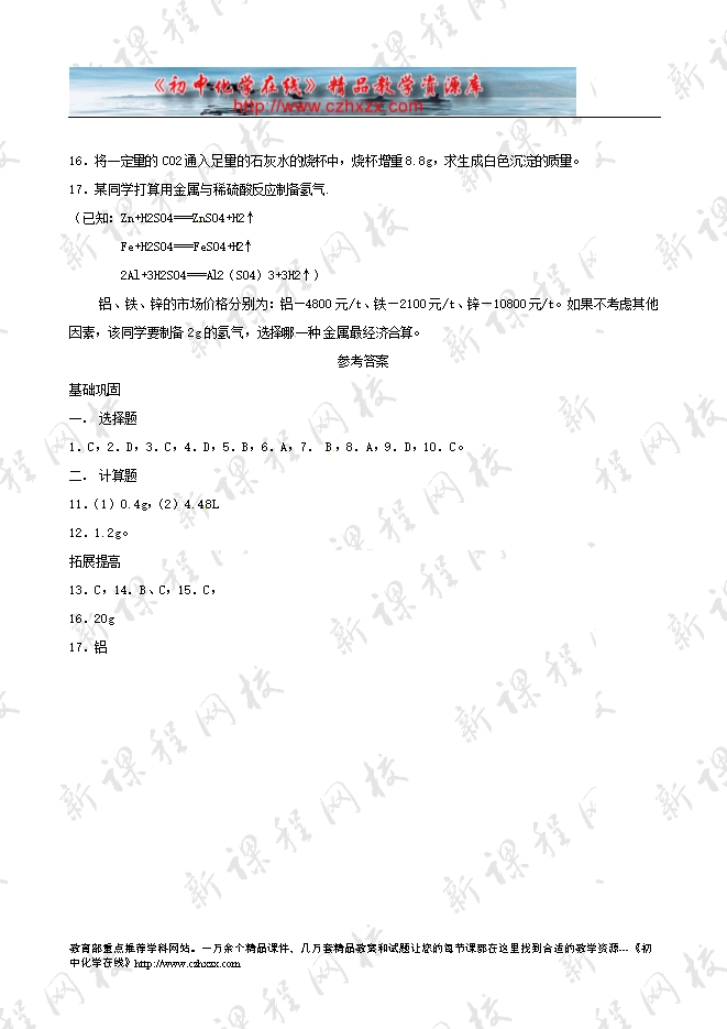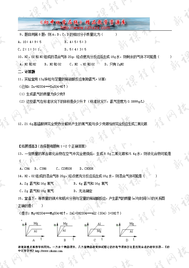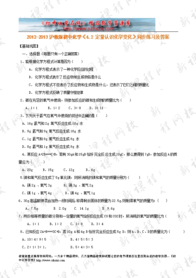 2012-2013沪教版初中化学《4.2 化学变化中的质量关系》同步练习及答案