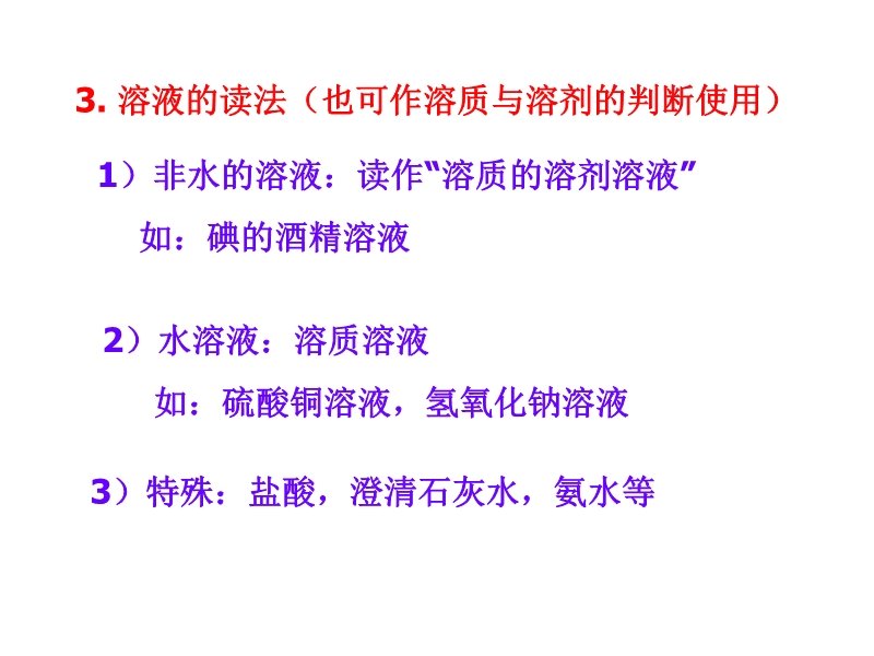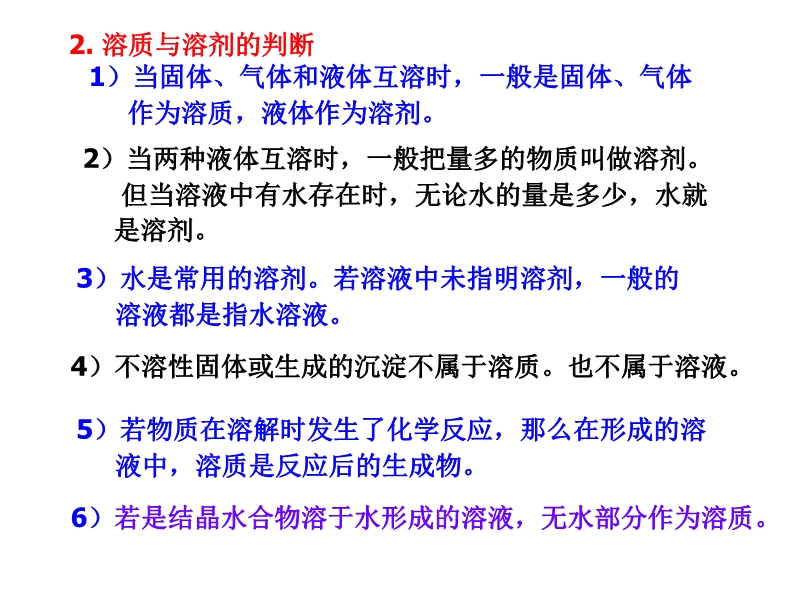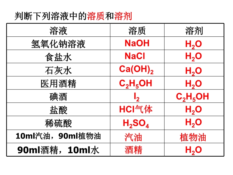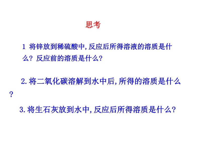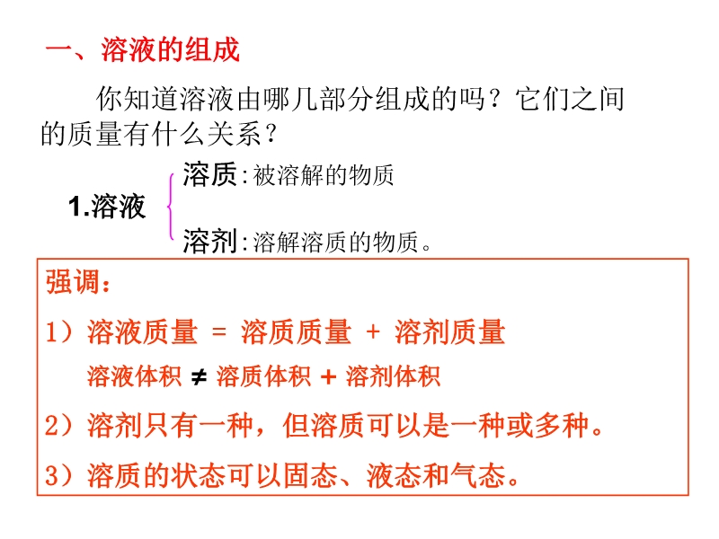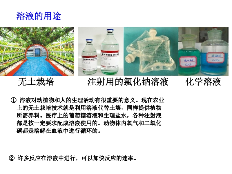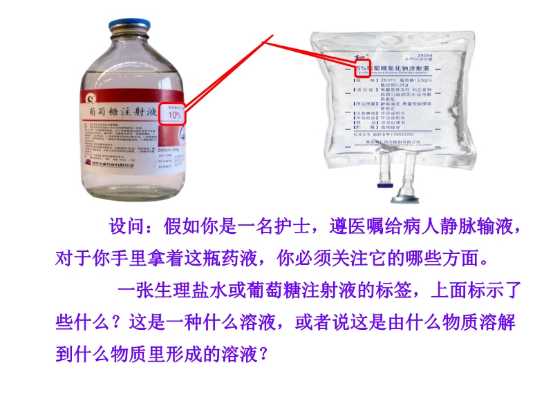 【内容简介】 设问:假如你是一名护士,遵医嘱给病人静脉输液,对于你手里拿着这瓶药液,你必须关注它的哪些方面。 一张生理盐水或葡萄糖注射液的标签,上面标示了些什么?这是一种什么溶液,或者说这是由什么物质溶解到什么物质里形成的溶液?当固体、气体和液体互溶时,一般是固体、气体 作为溶质,液体作为溶剂。当两种液体互溶时,一般把量多的物质叫做溶剂。 但当溶液中有水存在时,无论水的量是多少,水就 是溶剂。水是常用的溶剂。若溶液中未指明溶剂,一般的 溶液都是指水溶液不溶性固体或生成的沉淀不属于溶质。也不属于溶液若物质在溶解时发生了化学反应,那么在形成的溶液中,溶质是反应后的生成物若是结晶水合物溶于水形成的溶液,无水部分作为溶质1 将锌放到稀硫酸中,反应后所得溶液的溶质是什么? 反应前的溶质是什么?2.将二氧化碳溶解到水中后,所得的溶质是什么?3.将生石灰放到水中,反应后所得溶质是什么?......