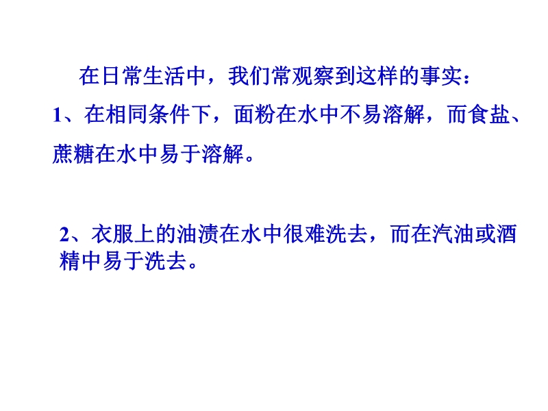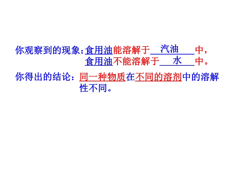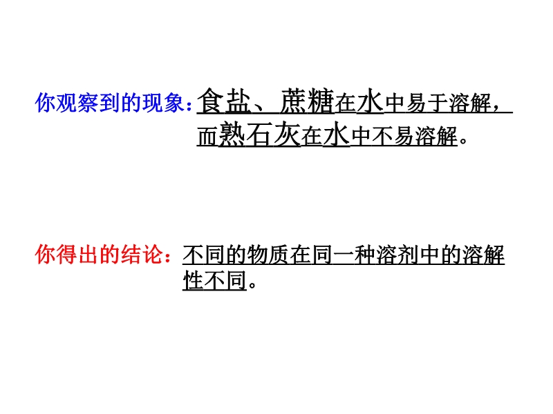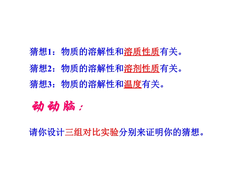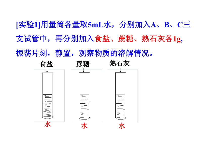【内容简介】物质是否可以无限制的溶解在一定量的溶剂里呢?溶解性:一种物质(溶质)溶解在另一种物质(溶剂)里的能力。影响物质的溶解性的因素有哪些?在日常生活中,我们常观察到这样的事实:1、在相同条件下,面粉在水中不易溶解,而食盐、蔗糖在水中易于溶解。2、衣服上的油渍在水中很难洗去,而在汽油或酒 精中易于洗去[实验1]用量筒各量取5mL水,分别加入A、B、C三支试管中,再分别加入食盐、蔗糖、熟石灰各1g,振荡片刻,静置,观察物质的溶解情况[实验2]取A、B两支试管,分别滴入少量食用油。往试管A中加入少量水,往试管B中加入少量汽油,振荡,观察现象。实验3:取1支试管,加入5mL水,然后加入3g硝酸钾,充分振荡,硝酸钾是否能完全溶解?如不能完全溶解,将试管加热,观察实验现象开始不能完全溶解,加热后完全溶解了同一种物质在同一种溶剂中的溶解性与温度有关......