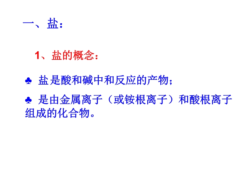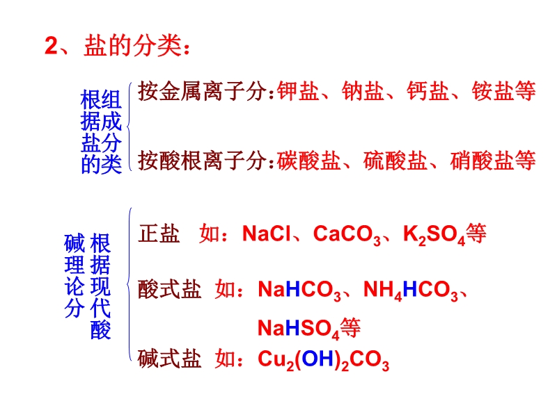 【内容简介】盐是酸和碱中和反应的产物; 是由金属离子(或铵根离子)和酸根离子组成的化合物思考:1、工业用盐含有什么而有毒?2、盐与食盐是否同一物质?什么是盐?3、食盐有哪些重要用途?思考:食盐有哪些制法 (1)直接开采法 (2)海水晒盐法(3)盐井水煮盐法 (4)盐湖水煮盐法某同学往一无色溶液中滴加稀盐酸,发现生成一种无色气体,将生成的气体通入澄清石灰水,发现石灰水变浑浊,于是他得出了该溶液中含有碳酸根离子,你认为他的结论正确么?为什么?1.左盆植株光照不充分2.左盆植株不是在适宜温度下种植的3.左盆植株施肥不适量结论:使茎杆健壮,促进植物生长所需的有机物的形成和运输......