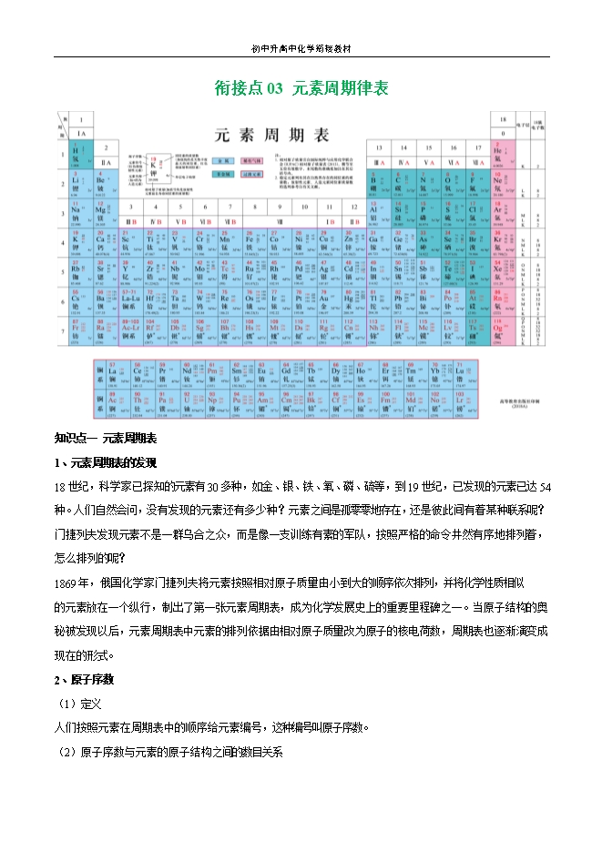 初中升高中化学衔接教材:衔接点03 元素周期律表(教师版和学生版)
