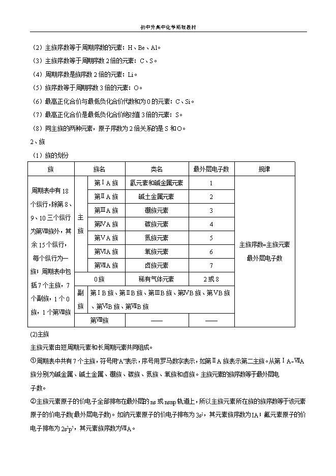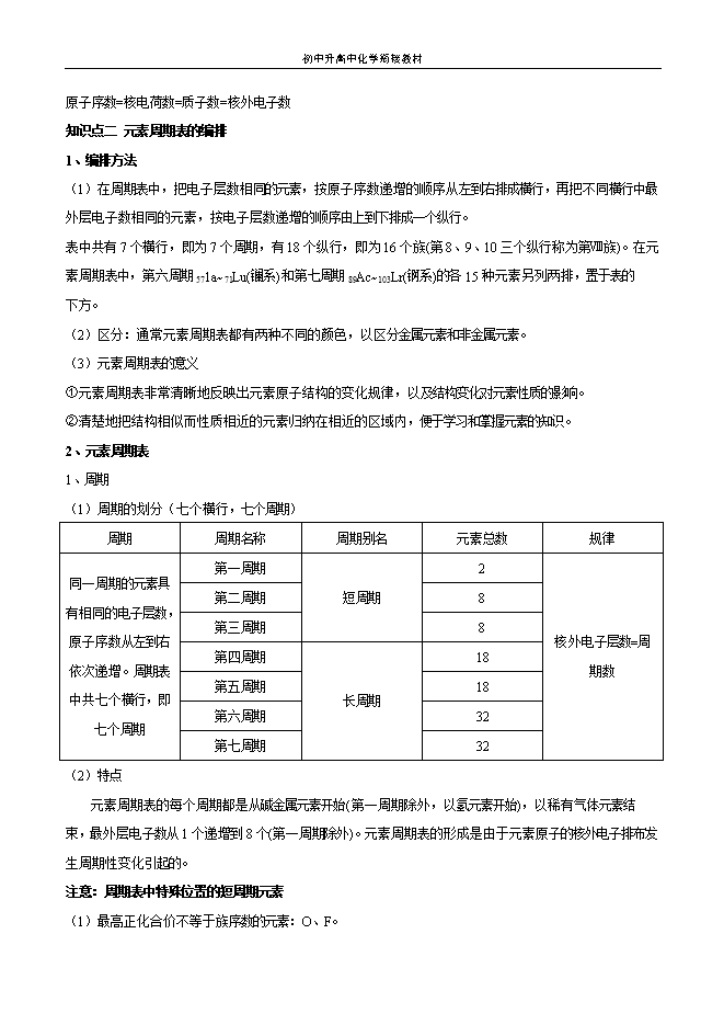 【内容简介】知识点一 元素周期表1、元素周期表的发现18世纪,科学家已探知的元素有30多种,如金、银、铁、氧、磷、硫等,到19世纪,已发现的元素已达54种。人们自然会问,没有发现的元素还有多少种?元素之间是孤零零地存在,还是彼此间有着某种联系呢? 门捷列夫发现元素不是一群乌合之众,而是像一支训练有素的军队,按照严格的命令井然有序地排列着,怎么排列的呢? 1869年,俄国化学家门捷列夫将元素按照相对原子质量由小到大的顺序依次排列,并将化学性质相似的元素放在一个纵行,制出了第一张元素周期表,成为化学发展史上的重要里程碑之一。当原子结构的奥秘被发现以后,元素周期表中元素的排列依据由相对原子质量改为原子的核电荷数,周期表也逐渐演变成现在的形式。2、原子序数(1)定义人们按照元素在周期表中的顺序给元素编号,这种编号叫原子序数。(2)原子序数与元素的原子结构之间的数目关系原子序数=核电荷数=质子数=核外电子数知识点二 元素周期表的编排1、编排方法(1)在周期表中,把电子层数相同的元素,按原子序数递增的顺序从左到右排成横行,再把不同横行中最外层电子数相同的元素,按电子层数递增的顺序由上到下排成一个纵行。表中共有7个横行,即为7个周期,有18个纵行,即为16个族(第8、9、10三个纵行称为第Ⅷ族)。在元素周期表中,第六周期571a~71Lu(镧系)和第七周期89Ac~103Lr(锕系)的各15种元素另列两排,置于表的下方。(2)区分:通常元素周期表都有两种不同的颜色,以区分金属元素和非金属元素。......