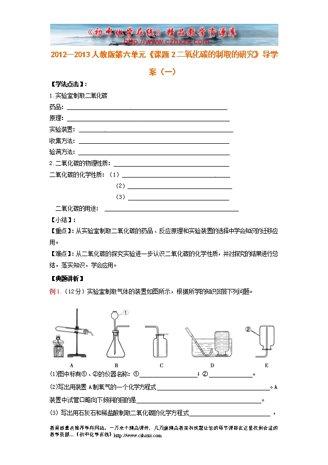 2012--2013人教版第六单元《课题2 二氧化碳的制取的研究》导学案(一)