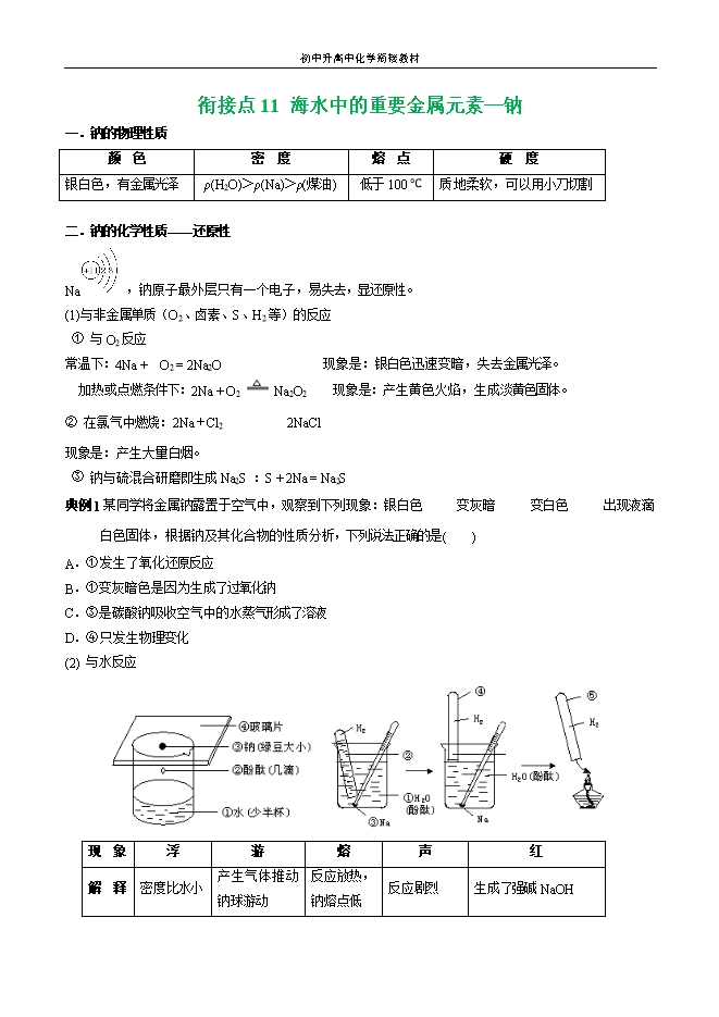 初中升高中化学衔接教材:衔接点11 海水中的重要金属元素—钠(教师版和学生版)