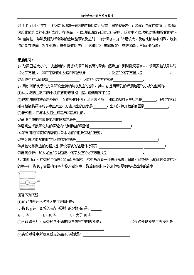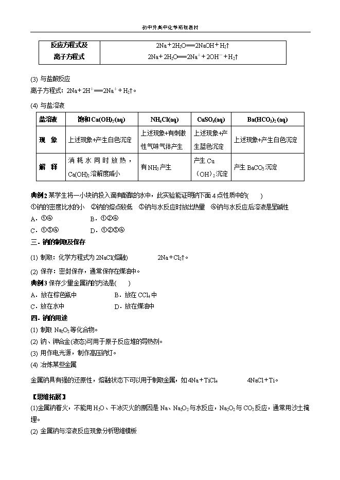 【内容简介】一.钠的物理性质颜 色密 度熔 点硬 度银白色,有金属光泽ρ(H2O)>ρ(Na)>ρ(煤油)低于100 ℃质地柔软,可以用小刀切割二.钠的化学性质——还原性Na ,钠原子最外层只有一个电子,易失去,显还原性。(1)与非金属单质(O2、卤素、S、H2等)的反应 ① 与O2反应常温下:4Na + O2 = 2Na2O 现象是:银白色迅速变暗,失去金属光泽。加热或点燃条件下:2Na + O2 Na2O2 现象是:产生黄色火焰,生成淡黄色固体。② 在氯气中燃烧:2Na+Cl2=====点燃2NaCl 现象是:产生大量白烟。 ③ 钠与硫混合研磨即生成Na2S :S + 2Na = Na2S典例1某同学将金属钠露置于空气中,观察到下列现象:银白色――→①变灰暗――→②变白色――→③出现液滴――→④白色固体,根据钠及其化合物的性质分析,下列说法正确的是( )A.①发生了氧化还原反应B.①变灰暗色是因为生成了过氧化钠C.③是碳酸钠吸收空气中的水蒸气形成了溶液D.④只发生物理变化【答案】A【解析】①变灰暗是因为钠与氧气反应生成了氧化钠,发生了氧化还原反应,A正确,B错误;③是氢氧化钠吸收空气中的水蒸气形成了溶液,C错误;④中氢氧化钠与空气中的CO2反应生成了碳酸钠,发生了化学变化,D错误. (2) 与水反应......