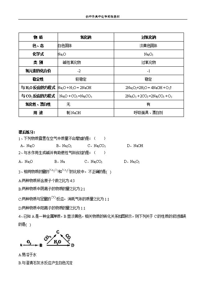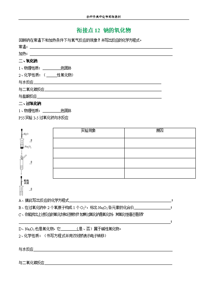 初中升高中化学衔接教材:衔接点12 钠的氧化物(教师版和学生版)
