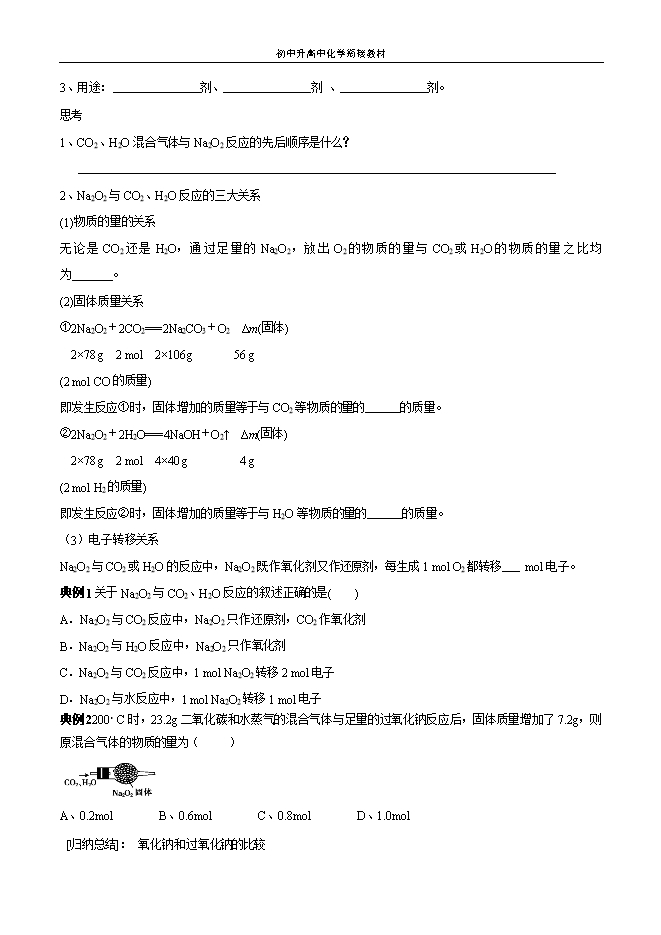 【内容简介】回顾钠在常温下和加热条件下与氧气反应的现象?并写出反应的化学方程式。常温: 加热: 二、氧化钠1、物理性质: 色固体 2、化学性质:( 性氧化物)与水反应 与二氧化碳反应 与盐酸反应 二、过氧化钠1、物理性质: 色固体P55实验3-5过氧化钠与水反应实验现象原因A、据此写出反应的化学方程式 ;B、在过氧化钠中2个氧原子构成1个O22-,标出Na2O2各元素的化合价 ;C、你能找出上述反应的氧化剂和还原剂?如果过氧化钠是氧化剂,其氧化性强还是弱? ;D、Na2O2也是氧化物,它 (是、否)属于碱性氧化物。2、化学性质:(书写方程式并用双线桥表示电子转移)与水反应 与二氧化碳反应 3、用途: 剂、 剂 、 剂。思考 1、CO2、H2O混合气体与Na2O2反应的先后顺序是什么? 2、Na2O2与CO2、H2O反应的三大关系(1)物质的量的关系无论是CO2还是H2O,通过足量的Na2O2,放出O2的物质的量与CO2或H2O的物质的量之比均为 。(2)固体质量关系①2Na2O2+2CO2===2Na2CO3+O2 Δm(固体) 2×78 g 2 mol 2×106 g 56 g(2 mol CO的质量)即发生反应①时,固体增加的质量等于与CO2等物质的量的 的质量。②2Na2O2+2H2O===4NaOH+O2↑ Δm(固体) 2×78 g 2 mol 4×40 g 4 g(2 mol H2的质量)即发生反应②时,固体增加的质量等于与H2O等物质的量的 的质量。(3)电子转移关系Na2O2与CO2或H2O的反应中,Na2O2既作氧化剂又作还原剂,每生成1 mol O2都转移 mol电子。典例1关于Na2O2与CO2、H2O反应的叙述正确的是( )A.Na2O2与CO2反应中,Na2O2只作还原剂,CO2作氧化剂B.Na2O2与H2O反应中,Na2O2只作氧化剂C.Na2O2与CO2反应中,1 mol Na2O2转移2 mol电子D.Na2O2与水反应中,1 mol Na2O2转移1 mol电子【答案】D【解析】Na2O2与CO2、H2O反应都是歧化反应,1 mol Na2O2转移1 mol电子典例2200。C时,23.2g二氧化碳和水蒸气的混合气体与足量的过氧化钠反应后,固体质量增加了7.2g,则原混合气体的物质的量为( )......