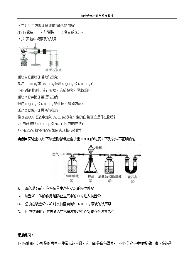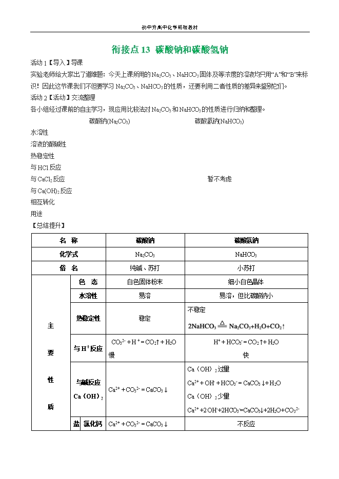 初中升高中化学衔接教材:衔接点13 碳酸钠和碳酸氢钠(教师版和学生版)
