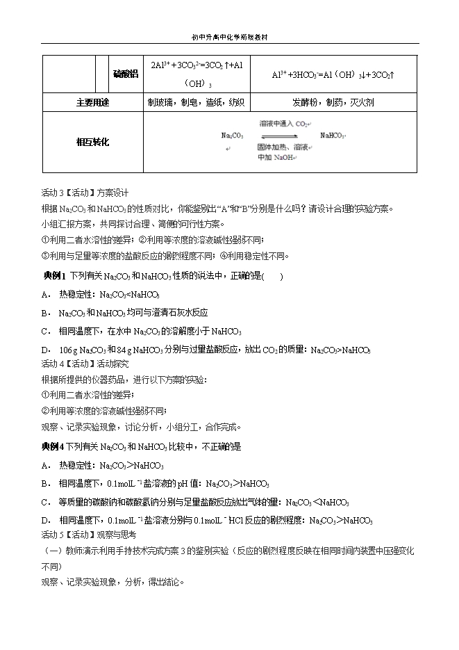 【内容简介】活动1【导入】导课;实验老师给大家出了道难题:今天上课所用的Na2CO3、NaHCO3固体及等浓度的溶液均只用“A”和“B”来标识!因此这节课我们不但要学习Na2CO3、NaHCO3的性质,还要利用二者性质的差异来鉴别它们。活动2【活动】交流整理各小组经过课前的自主学习,现应用比较法对Na2CO3和NaHCO3的性质进行归纳和整理。碳酸氢钠(NaHCO3)水溶性溶液的酸碱性热稳定性与HCl反应与CaCl2反应暂不考虑与Ca(OH)2反应相互转化用途【总结提升】名 称碳酸钠碳酸氢钠化学式Na2CO3NaHCO3俗 名纯碱、苏打小苏打主要性质色 态白色固体粉末细小白色晶体水溶性易溶易溶,但比碳酸钠小热稳定性稳定不稳定与H+反应 CO32- + H + = CO2↑ + H2O慢H+ + HCO3- = CO2 ↑+ H2O快与碱反应Ca(OH)2Ca2+ + CO32- = CaCO3 ↓Ca(OH)2过量Ca2+ + OH- + HCO3- = CaCO3 ↓+ H2OCa(OH)2少量Ca2+ +2 OH-+2HCO3-=CaCO3↓+2H2O+ CO32-盐氯化钙Ca2+ + CO32- = CaCO3 ↓不反应硫酸铝2Al3+ + 3CO32-=3CO2 ↑+Al(OH)3Al3+ +3HCO3-=Al(OH)3↓+ 3CO2↑主要用途制玻璃,制皂,造纸,纺织发酵粉,制药,灭火剂相互转化;活动3【活动】方案设计根据Na2CO3和NaHCO3的性质对比,你能鉴别出“A”和“B”分别是什么吗?请设计合理的实验方案。小组汇报方案,共同探讨合理、简便的可行性方案。①利用二者水溶性的差异;②利用等浓度的溶液碱性强弱不同;③利用与足量等浓度的盐酸反应的剧烈程度不同;④利用稳定性不同。;典例1 下列有关Na2CO3和NaHCO3性质的说法中,正确的是( )A. 热稳定性:Na2CO3;NaHCO3B. Na2CO3和NaHCO3均可与澄清石灰水反应C. 相同温度下,在水中Na2CO3的溶解度小于NaHCO3D. 106 g Na2CO3和84 g NaHCO3分别与过量盐酸反应,放出CO2的质量:Na2CO3;NaHCO3【答案】B......