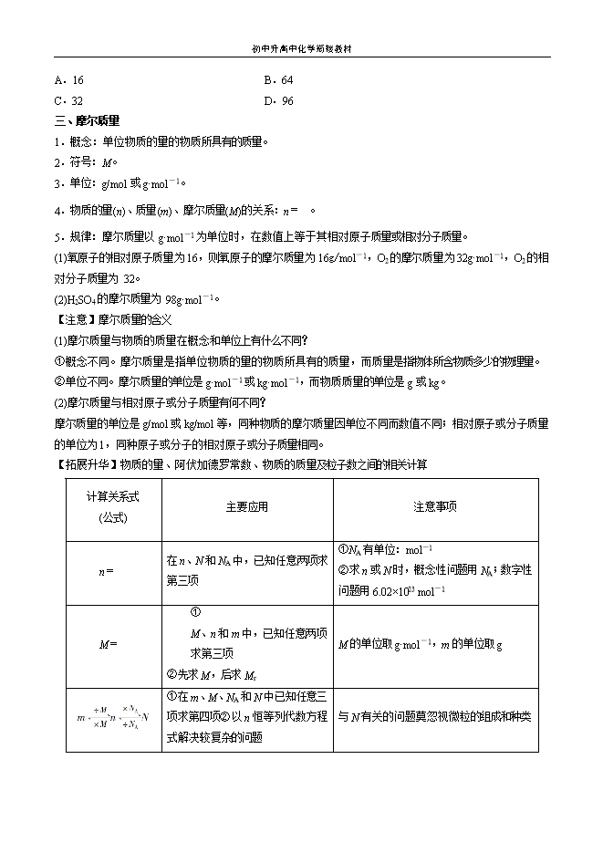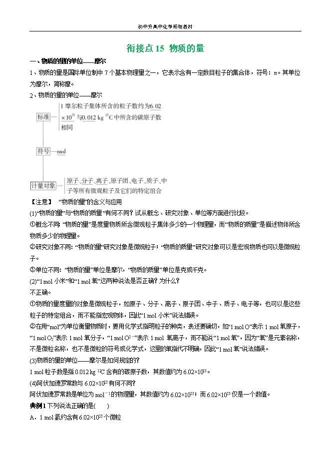 初中升高中化学衔接教材:衔接点15 物质的量(教师版和学生版)