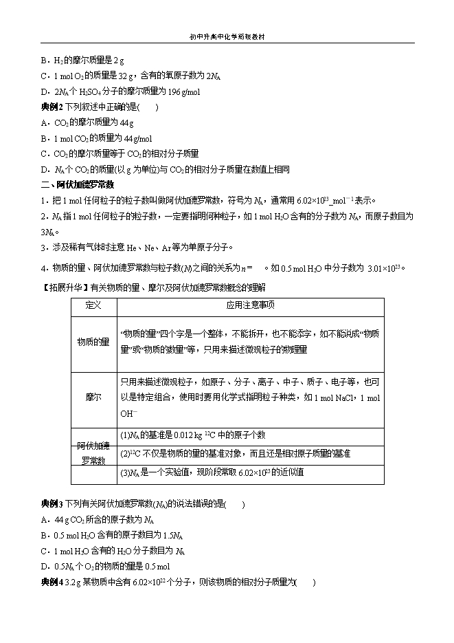 【内容简介】一、物质的量的单位——摩尔1、物质的量是国际单位制中7个基本物理量之一,它表示含有一定数目粒子的集合体,符号:n。其单位为摩尔,简称摩。2、物质的量的单位——摩尔 【注意】 “物质的量”的含义与应用(1)“物质的量”与“物质的质量”有何不同?试从概念、研究对象、单位等方面进行比较。①概念不同:“物质的量”是度量物质所含微观粒子集体多少的一个物理量,而“物质的质量”是描述物体所含物质多少的物理量。②研究对象不同:“物质的量”研究对象是微观粒子;“物质的质量”研究对象可以是宏观物质也可以是微观粒子。③单位不同:“物质的量”单位是摩尔,“物质的质量”单位是克或千克。(2)“1 mol小米”和“1 mol氧”这两种说法是否正确?为什么?不正确。①物质的量度量的对象是微观粒子,如原子、分子、离子、原子团、中子、质子、电子等,也可以是这些粒子的特定组合,而不能指宏观物体,因此“1 mol小米”说法错误。②在用“mol”为单位衡量物质时,要用化学式指明粒子的种类,表述要确切,如“1 mol O”表示1 mol氧原子,“1 mol O2”表示1 mol氧分子,“1 mol O2-”表示1 mol 氧离子,而不能说“1 mol氧”,因为“氧”是元素名称,不是微粒名称,也不是微粒的符号或化学式,这里的氧指代不明确,因此“1 mol氧”说法错误。(3)物质的量的单位——摩尔是如何规定的?1 mol粒子数是指0.012 kg 12C含有的碳原子数,其数值约为6.02×1023。(4)阿伏加德罗常数与6.02×1023有何不同?阿伏加德罗常数是单位为mol-1的物理量,其数值约为6.02×1023;而6.02×1023仅是一个数值。典例1下列说法正确的是( )A.1 mol氢约含有6.02×1023个微粒.......