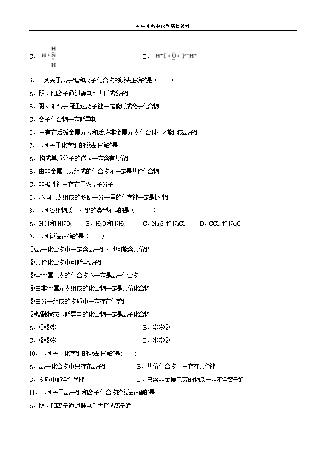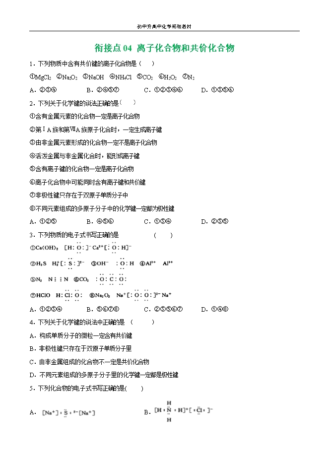 初中升高中化学衔接教材练习卷:衔接点04 离子化合物和共价化合物(解析版和原卷版)