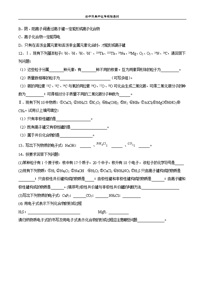 【内容简介】1.下列物质中含有共价键的离子化合物是( )①MgCl2 ②Na2O2 ③NaOH ④NH4Cl ⑤CO2 ⑥H2O2 ⑦N2A.②③④B.②④⑤⑦C.①②③④⑥D.①③⑤⑥【答案】A【解析】①MgCl2中镁离子和氯离子之间只存在离子键,故①错误;②Na2O2中钠离子和过氧根离子之间存在离子键,过氧根离子中氧原子和氧原子之间存在共价键,故②正确;③NaOH中钠离子和氢氧根离子间存在离子键,氢氧根离子中氧原子和氢原子之间存在共价键,故③正确;④NH4Cl中氯离子和铵根离子中存在离子键,铵根离子中氮原子和氢原子之间存在共价键,故④正确;⑤CO2中碳原子和氧原子之间存在共价键,故⑤错误;⑥H2O2中氢原子和氧原子之间存在共价键,故⑥错误;⑦N2中氮原子和氮原子之间存在共价键,故⑦错误。故含有共价键的离子化合物是②③④。故选A。【点睛】含共价键的离子化合物有:①铵盐类,如NH4Cl、NH4NO3、(NH4)2CO3等;②强碱类,如KOH、NaOH等;③含氧酸盐,如K2SO4、NaHCO3等;④过氧化物,如Na2O2,超氧化物,如KO2。2.下列关于化学键的说法正确的是 ①含有金属元素的化合物一定是离子化合物 ②第ⅠA族和第ⅦA族原子化合时,一定生成离子键 ③由非金属元素形成的化合物一定不是离子化合物 ④活泼金属与非金属化合时,能形成离子键 ⑤含有离子键的化合物一定是离子化合物 ⑥离子化合物中可能同时含有离子键和共价键 ⑦非极性键只存在于双原子单质分子中⑧不同元素组成的多原子分子中的化学键一定都为极性键A.①②⑤B.④⑤⑥C.①③④D.②③⑤【答案】B【解析】①含有金属元素的化合物不一定是离子化合物,如AlCl3属于共价化合物,故①说法错误;②第IA族包括H和碱金属,如果是H与ⅦA族元素形成化合物,该化合物属于共价化合物,故②说法错误;③由非金属元素形成的化合物可能是离子化合物,如铵盐,故③说法错误;......