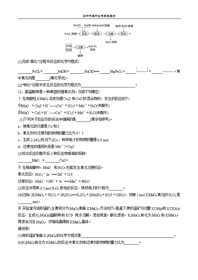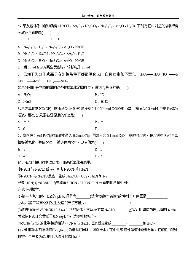 【内容简介】1.已知在碱性溶液中可发生如下反应:2R(OH)3+3ClO-+4OH-===2ROn-4+3Cl-+5H2O。则ROn-4中R的化合价是( )A.+3 B.+4C.+5 D.+6【答案】D【解析】根据离子反应中反应前后电荷守恒,可得3+4=2n+3,解得n=2。所以RO2-4中R元素的化合价为+6价。2.工业上将Na2CO3和Na2S以1∶2的物质的量之比配成溶液,再通入SO2,可制取Na2S2O3,同时放出CO2。在该反应中( )A.硫元素被氧化B.氧化剂与还原剂的物质的量之比为1∶2C.每生成1 mol Na2S2O3,转移4 mol电子D.相同条件下,每吸收10 m3 SO2就会放出2.5 m3 CO2【答案】D【解析】A.在反应物Na2S中S元素的化合价为-2价,在SO2中S元素的化合价为+4价,反应后产生的物质Na2S2O3中,S元素的化合价为+2价,介于-2价与+4价之间,因此硫元素既被氧化又被还原,错误;B.根据题意可得在溶液中发生反应的方程式是Na2CO3+2Na2S+4SO2===3Na2S2O3+CO2,在反应中氧化剂SO2与还原剂Na2S的物质的量之比为4∶2=2∶1,错误。C.根据B选项的化学方程式可知,每生成3 mol Na2S2O3,转移8 mol电子,则产生1 mol Na2S2O3,转移83 mol电子,错误。D.根据反应方程式可知消耗的SO2与产生的CO2的物质的量之比是4∶1,相同条件下,消耗SO2与产生的CO2的体积之比也为4∶1,故D项正确。3.已知二氧化硒是一种氧化剂,它可由Se+2H2SO4(浓)===2SO2↑+SeO2+2H2O制取。又知离子方程式aSeO2+bSO2+cH2O===aSe+b__X__+d__Y__;则关于下列叙述正确的是( )A.a∶b=1∶1B.Y为OH-C.氧化性为SeO2>H2SO4(浓)D.若每生成0.2 mol X则该反应转移0.4NA个电子【答案】D【解析】根据题意SeO2是氧化剂,则可将二氧化硫氧化为硫酸,根据原子守恒知X是硫酸,Y不含Se、S,则没有Y生成,根据得失电子相等知a∶b=1∶2,A、B错误,D正确;根据氧化性:氧化剂>氧化产物知C错误。4.NaNO2是一种食品添加剂,它能致癌。酸性高锰酸钾溶液与亚硝酸钠反应的离子方程式是MnO-4+ NO-2+―→Mn2++NO-3+H2O。下列叙述正确的是 ( )A.该反应中NO-2被还原B.反应过程中溶液的pH变小......