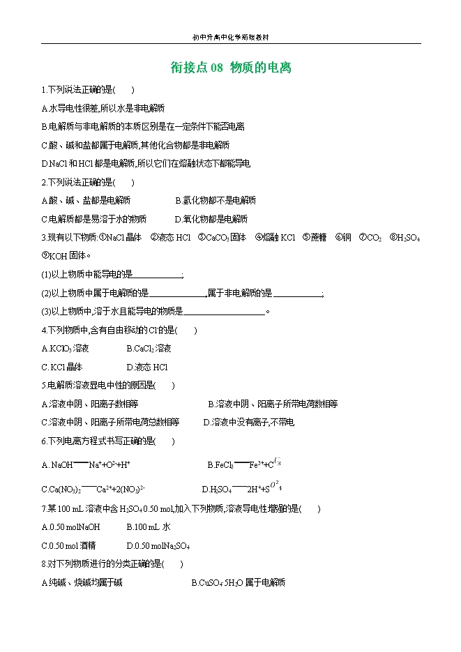 初中升高中化学衔接教材练习卷:衔接点08 物质的电离(解析版和原卷版)