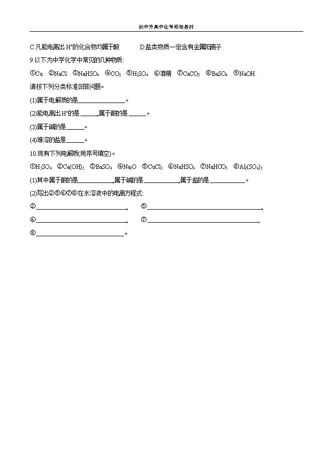 【内容简介】1.下列说法正确的是( )A.水导电性很差,所以水是非电解质B.电解质与非电解质的本质区别是在一定条件下能否电离C.酸、碱和盐都属于电解质,其他化合物都是非电解质D.NaCl和HCl都是电解质,所以它们在熔融状态下都能导电【答案】B【解析】A项,水是电解质;C项,部分氧化物也属于电解质,如Na2O、CaO;D项,HCl在熔融状态下不能导电。2.下列说法正确的是( )A.酸、碱、盐都是电解质 B.氢化物都不是电解质C.电解质都是易溶于水的物质 D.氧化物都是电解质【答案】A【解析】电解质是根据化合物能否电离出离子划分的,不是根据化合物的水溶性划分的,如BaSO4、CaCO3等不溶于水的物质,都是电解质,C错。氧化物有的是电解质,如Na2O等活泼金属的氧化物;有的不是电解质,如SO2等非金属氧化物,D错。氢化物有的是电解质,如HCl等;有的不是电解质,如CH4等,B错。3.现有以下物质:①NaCl晶体 ②液态HCl ③CaCO3固体 ④熔融KCl ⑤蔗糖 ⑥铜 ⑦CO2 ⑧H2SO4 ⑨KOH固体。(1)以上物质中能导电的是 ; (2)以上物质中属于电解质的是 ,属于非电解质的是 ; (3)以上物质中,溶于水且能导电的物质是 。 【答案】(1)④⑥ (2)①②③④⑧⑨ ⑤⑦ (3)①②④⑦⑧⑨【解析】物质导电的原因是有自由移动离子或自由移动电子;电解质、非电解质都是化合物,前者在水溶液中或熔融状态下能导电,后者不能。4.下列物质中,含有自由移动的Cl-的是( )A.KClO3溶液 B.CaCl2溶液 C. KCl晶体 D.液态HCl【答案】B【解析】KClO3溶液中存在K+、ClO3-;KCl晶体中的Cl-不能自由移动;液态HCl中只存在HCl分子。5.电解质溶液显电中性的原因是( )A.溶液中阴、阳离子数相等 B.溶液中阴、阳离子所带电荷数相等C.溶液中阴、阳离子所带电荷总数相等 D.溶液中没有离子,不带电【答案】C【解析】电荷守恒是指溶液中阴、阳离子所带电荷总数相等,如Na2SO4溶液中Na+的数目是S 的2倍,S 所带电荷数是Na+的2倍,A、B、D均错误。6.下列电离方程式书写正确的是( )......