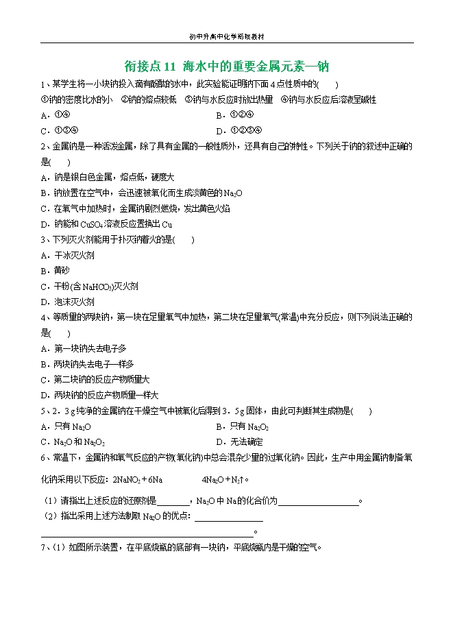 初中升高中化学衔接教材练习卷:衔接点11 海水中的重要金属元素—钠(解析版和原卷版)