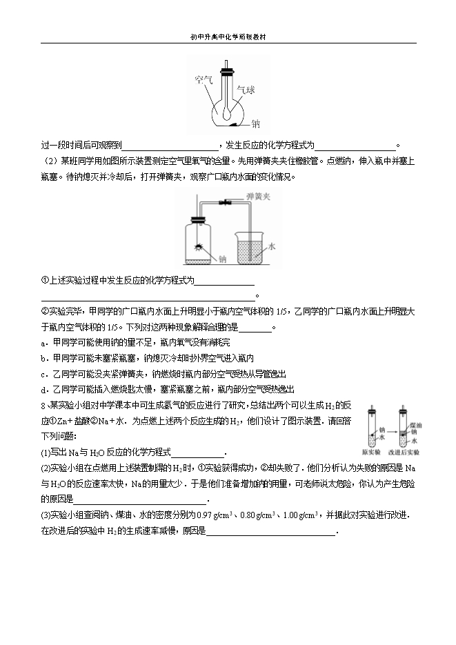 【内容简介】1、某学生将一小块钠投入滴有酚酞的水中,此实验能证明钠下面4点性质中的( )①钠的密度比水的小 ②钠的熔点较低 ③钠与水反应时放出热量 ④钠与水反应后溶液呈碱性A.①④B.①②④C.①③④ D.①②③④【答案】D【解析】钠浮在水面上可以说明①正确,钠熔成光亮的小球说明②③正确,反应后溶液变为红色,说明④正确。2、金属钠是一种活泼金属,除了具有金属的一般性质外,还具有自己的特性。下列关于钠的叙述中正确的是( )A.钠是银白色金属,熔点低,硬度大B.钠放置在空气中,会迅速被氧化而生成淡黄色的Na2OC.在氧气中加热时,金属钠剧烈燃烧,发出黄色火焰D.钠能和CuSO4溶液反应置换出Cu【答案】C【解析】A项,钠可用小刀切割,硬度小;B项,钠放置在空气中,会被缓慢氧化生成白色的Na2O;D项,钠先与水发生反应生成NaOH,NaOH可与CuSO4发生反应生成Cu(OH)2蓝色絮状沉淀,不会将Cu置换出来。3、下列灭火剂能用于扑灭钠着火的是( )A.干冰灭火剂B.黄砂C.干粉(含NaHCO3)灭火剂D.泡沫灭火剂【答案】B【解析】利用Na与水反应,Na2O2与CO2反应,Na2O2与水反应性质判断。4、等质量的两块钠,第一块在足量氧气中加热,第二块在足量氧气(常温)中充分反应,则下列说法正确的是( )A.第一块钠失去电子多B.两块钠失去电子一样多C.第二块钠的反应产物质量大D.两块钠的反应产物质量一样大......