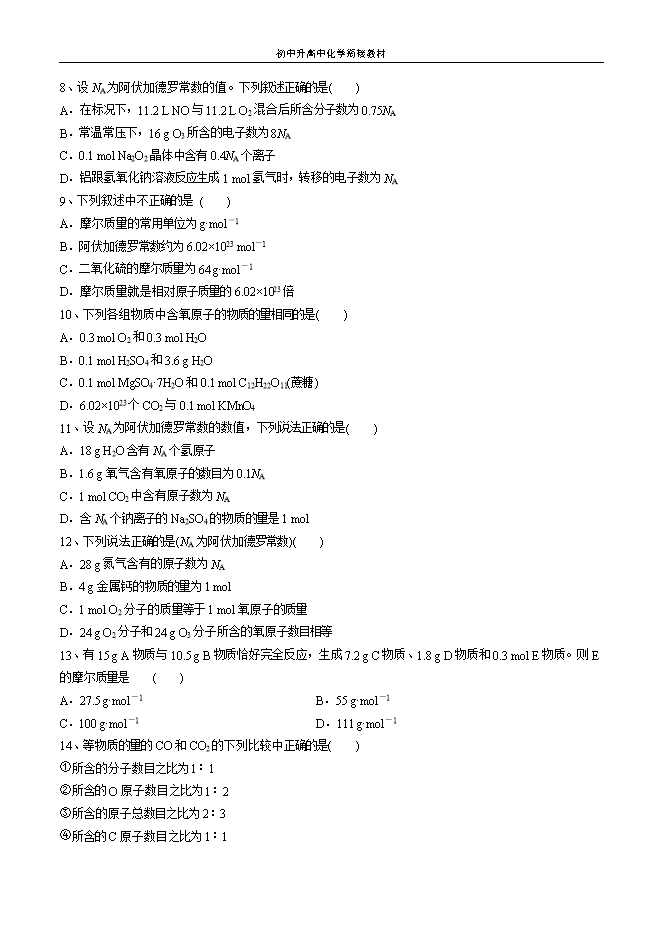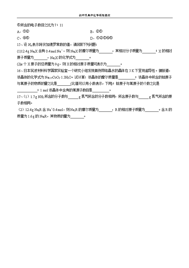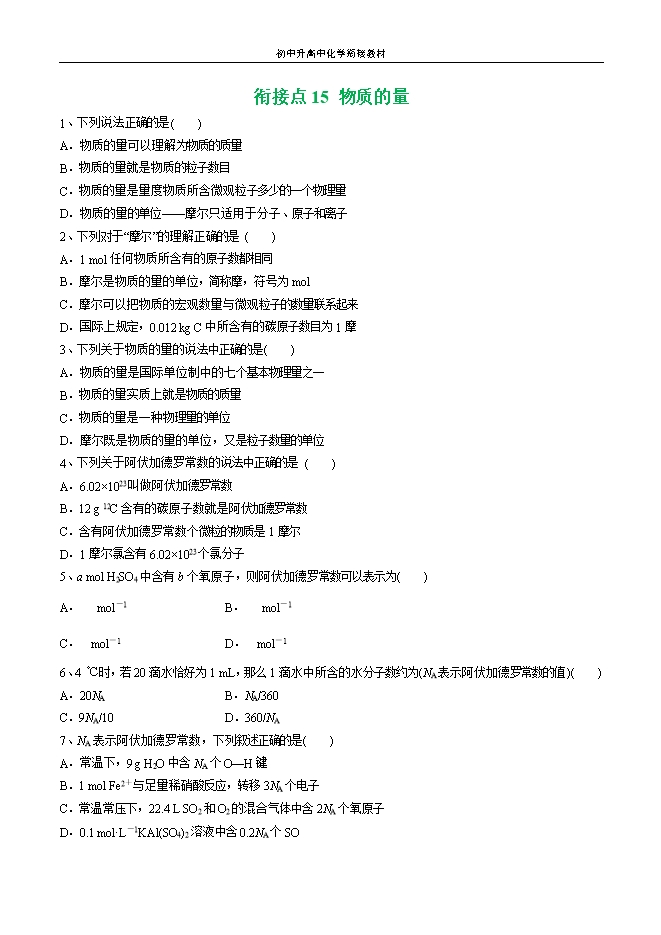 初中升高中化学衔接教材练习卷:衔接点15 物质的量(解析版和原卷版)