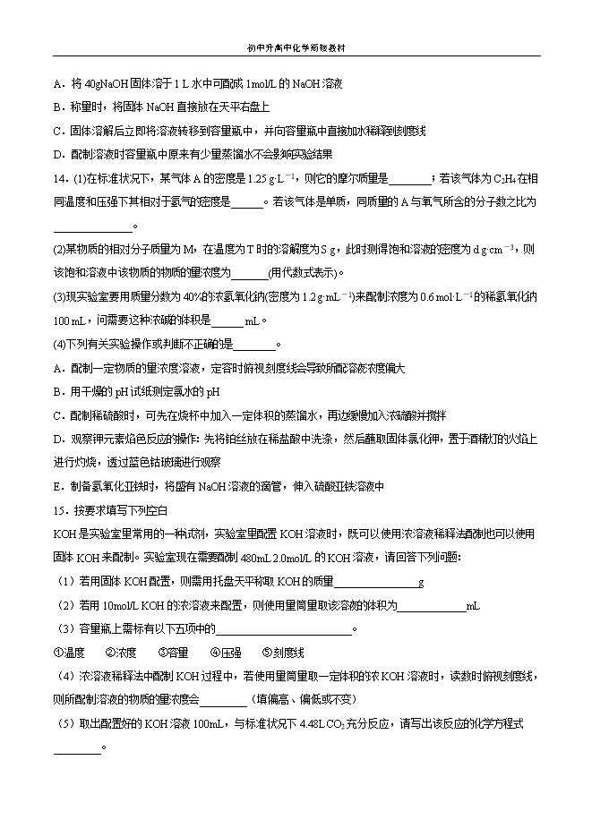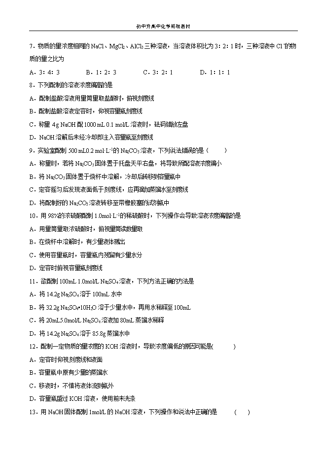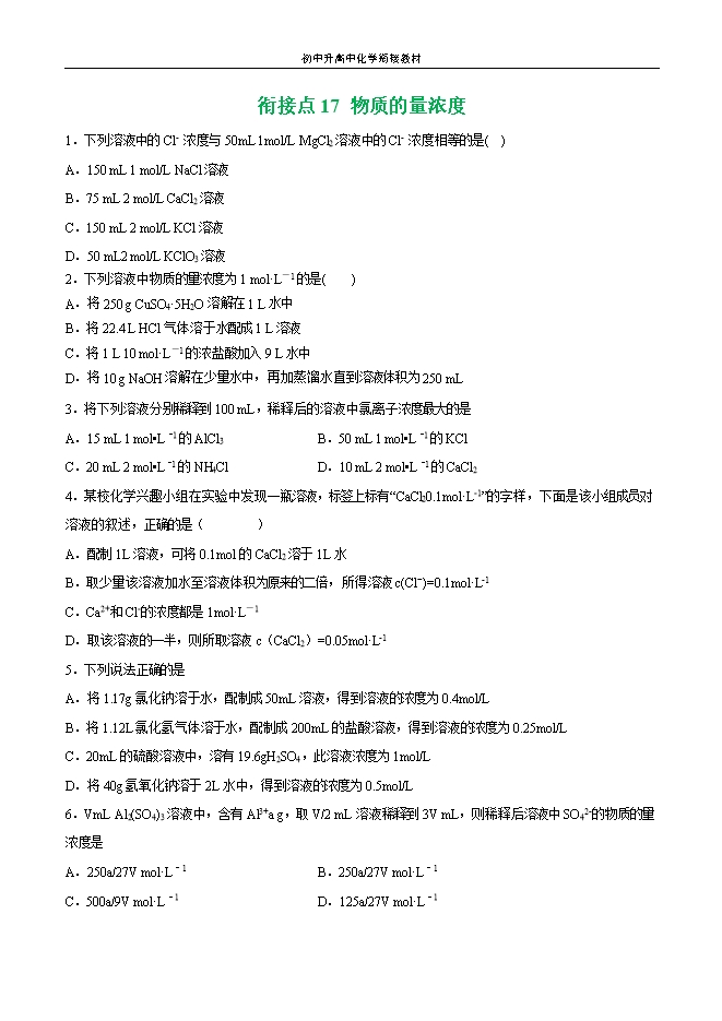 初中升高中化学衔接教材练习卷:衔接点17 物质的量浓度(解析版和原卷版)