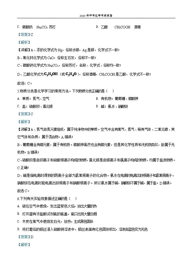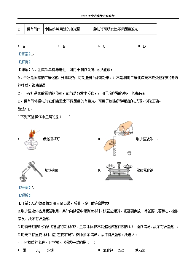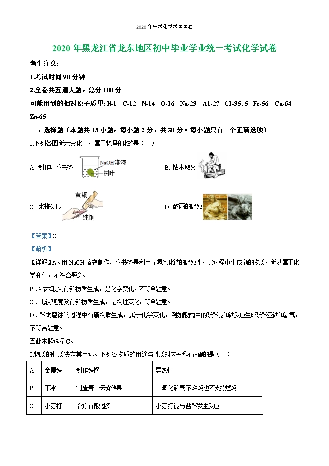 【内容简介】一、选择题(本题共15小题,每小题2分,共30分。每小题只有一个正确选项)1.下列各图所示变化中,属于物理变化的是( )A. 制作叶脉书签 B. 钻木取火 C. 比较硬度 D. 酸雨的腐蚀 【答案】C【解析】【详解】A、用NaOH溶液制作叶脉书签是利用了氢氧化钠的腐蚀性,此过程中生成新的物质,所以属于化学变化,不符合题意。B、钻木取火有新物质生成,是化学变化,不符合题意。C、比较硬度没有新物质生成,是物理变化,符合题意。D、酸雨腐蚀的过程中有新物质生成,属于化学变化,例如酸雨中的硫酸能和铁反应生成硫酸亚铁和氢气,不符合题意。因此本题选择C。2.物质的性质决定其用途。下列各物质的用途与性质对应关系不正确的是( )A金属铁制作铁锅导热性B干冰制造舞台云雾效果二氧化碳既不燃烧也不支持燃烧C小苏打治疗胃酸过多小苏打能与盐酸发生反应D稀有气体制造多种用途的电光源通电时可以发出不同颜色的光A. AB. BC. CD. D【答案】B【解析】【详解】A、金属铁具有导电性,可用于制作铁锅,说法正确。B、干冰是固态的二氧化碳,升华吸热,可制造舞台烟雾效果,并不是利用二氧化碳既不燃烧也不支持燃烧的性质,说法错误。C、小苏打是碳酸氢钠的俗称,能与盐酸发生反应,可用于治疗胃酸过多,说法正确。D、稀有气体通电时它们会发出不同颜色的有色光,可用于制造多种用途的电光源,说法正确。故选:B。3.下列实验操作中正确的是( )......