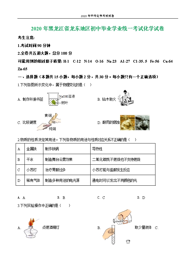 黑龙江省龙东地区2020年初中毕业学业统一考试化学试卷(原卷版)