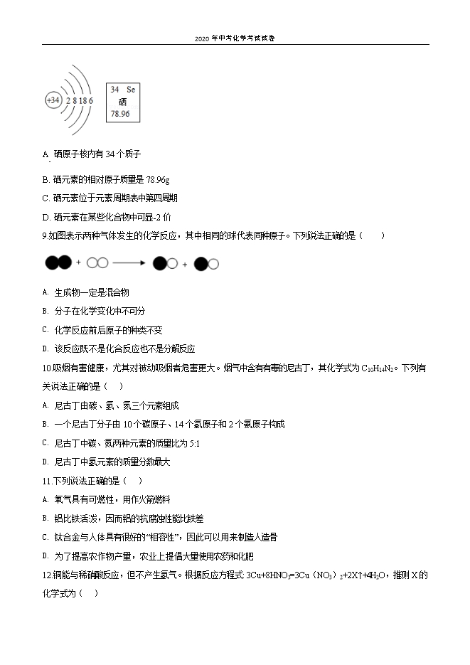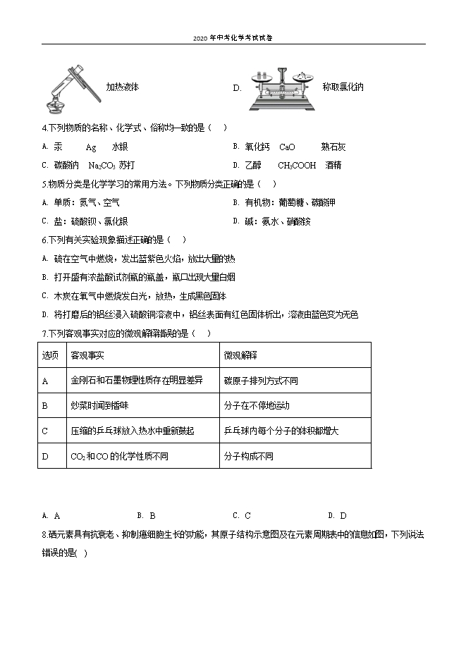 【内容简介】1.下列各图所示变化中,属于物理变化的是( )A. 制作叶脉书签 B. 钻木取火 C. 比较硬度 D. 酸雨的腐蚀 2.物质的性质决定其用途。下列各物质的用途与性质对应关系不正确的是( )A金属铁制作铁锅导热性B干冰制造舞台云雾效果二氧化碳既不燃烧也不支持燃烧C小苏打治疗胃酸过多小苏打能与盐酸发生反应D稀有气体制造多种用途的电光源通电时可以发出不同颜色的光A. AB. BC. CD. D3.下列实验操作中正确的是( )A. 点燃酒精灯B. 取少量液体C. 加热液体D. 称取氯化钠4.下列物质的名称、化学式、俗称均一致的是( )A. 汞 Ag 水银B. 氧化钙 CaO 熟石灰C. 碳酸钠 Na2CO3 苏打D. 乙醇 CH3COOH 酒精5.物质分类是化学学习的常用方法。下列物质分类正确的是( )A. 单质:氮气、空气B. 有机物:葡萄糖、碳酸钾C. 盐:硫酸钡、氯化银D. 碱:氨水、硝酸铵6.下列有关实验现象描述正确的是( )A. 硫在空气中燃烧,发出蓝紫色火焰,放出大量的热B. 打开盛有浓盐酸试剂瓶的瓶盖,瓶口出现大量白烟C. 木炭在氧气中燃烧发白光,放热,生成黑色固体D. 将打磨后的铝丝浸入硫酸铜溶液中,铝丝表面有红色固体析出,溶液由蓝色变为无色7.下列客观事实对应的微观解释错误的是( )选项客观事实微观解释A金刚石和石墨物理性质存 明显差异碳原子排列方式不同B炒菜时闻到香味分子在不停地运动C压缩的乒乓球放入热水中重新鼓起乒乓球内每个分子的体积都增大DCO2和CO的化学性质不同分子构成不同.......