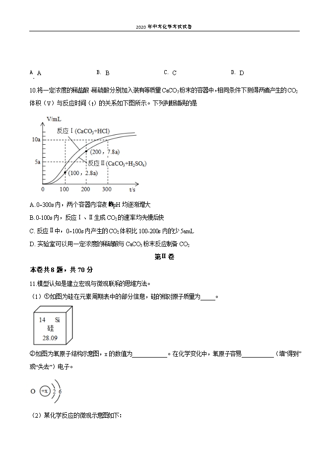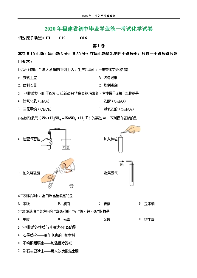 福建省2020年初中毕业学业统一考试化学试卷(原卷版)