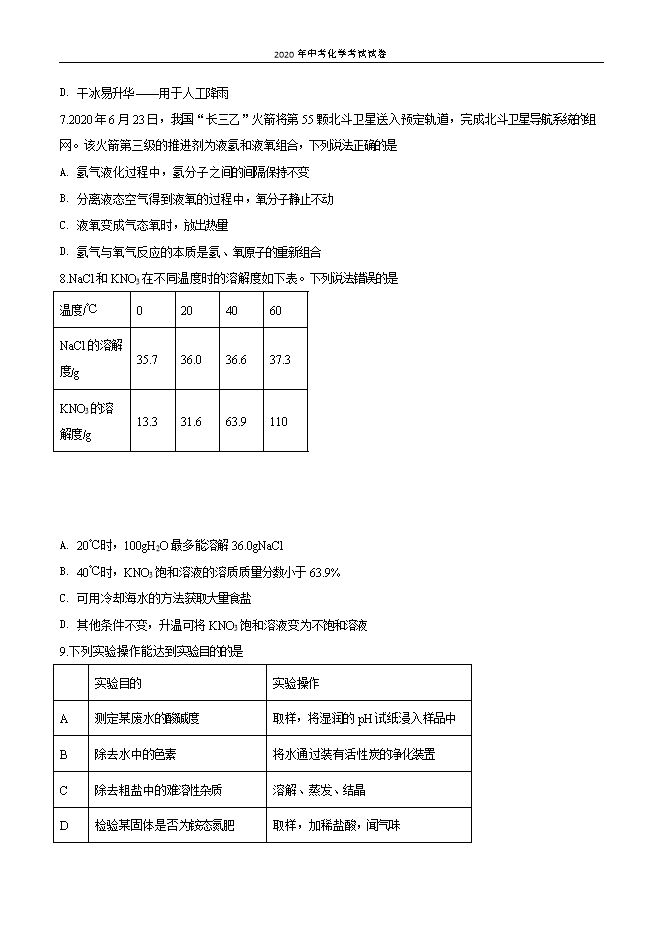 【内容简介】1.远古时期,半坡人从事的下列生活、生产活动中,一定有化学变化的是A. 夯筑土屋B. 结绳记事C. 磨制石器D. 烧制彩陶2.下列物质均可用于配制灭活新型冠状病毒的消毒剂,其中属于无机化合物的是A. 过氧化氢(H2O2)B. 乙醇(C2H6O)C. 三氯甲烷(CHCl3)D. 过氧乙酸(C2H4O3)3.在制取氢气( )的实验中,下列操作正确的是A. 检查气密性 B. 加入锌粒 C. 加入稀硫酸 D. 收集氢气 4.下列食物中,蛋白质含量最高的是A. 米饭B. 瘦肉C. 青菜D. 玉米油5.“加铁酱油”“高锌奶粉”“富硒茶叶”中,“铁、锌、硒”指 是A. 单质B. 元素C. 金属D. 维生素6.下列物质的性质与其用途不匹配的是A. 石墨质软——用作电池的电极材料B. 不锈钢耐腐蚀——制造医疗器械C. 熟石灰显碱性——用来改良酸性土壤D. 干冰易升华——用于人工降雨7.2020年6月23日,我国“长三乙”火箭将第55颗北斗卫星送入预定轨道,完成北斗卫星导航系统的组网。该火箭第三级的推进剂为液氢和液氧组合,下列说法正确的是A. 氢气液化过程中,氢分子之间的间隔保持不变B. 分离液态空气得到液氧的过程中,氧分子静止不动C. 液氧变成气态氧时,放出热量D. 氢气与氧气反应的本质是氢、氧原子的重新组合8.NaCl和KNO3在不同温度时的溶解度如下表。下列说法错误的是温度/℃0204060NaCl的溶解度/g35.736.036.637.3KNO3的溶解度/g13.331.663.9110A. 20℃时,100gH2O最多能溶解36.0gNaClB. 40℃时,KNO3饱和溶液的溶质质量分数小于63.9%C. 可用冷却海水的方法获取大量食盐D. 其他条件不变,升温可将KNO3饱和溶液变为不饱和溶液9.下列实验操作能达到实验目的的是......