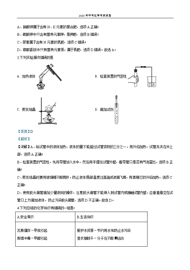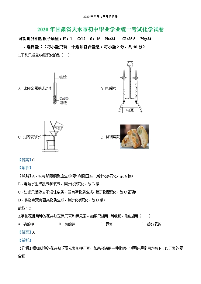 【内容简介】一、选择题((每小题只有一个选项符合题意。每小题2分,共30分)1.下列只发生物理变化的是( )A. 比较金属的活动性 B. 电解水 C. 过滤泥浆水 D. 食物霉变 【答案】C【解析】【详解】A、铁与硫酸铜反应生成铜和硫酸亚铁,属于化学变化,故A错;B、电解水生成氢气和氧气,属于化学变化,故B错;C、过滤只是除去不溶性杂质,没有新物质生成,属于物理变化,故C正确;D、食物霉变有菌类物质生成,属于化学变化,故D错。故选:C。2.学校花圃所种的花卉缺乏氮元素和钾元素。如果只施用一种化肥,则应施用( )A. 硝酸钾B. 碳酸钾C. 尿素D. 碳酸氢铵【答案】A【解析】【详解】根据所种的花卉缺乏氮元素和钾元素,如果只施用一种化肥,说明必须施用含有N、K元素的复合肥;A、硝酸钾属于含有N、K元素的复合肥,选项A正确;B、碳酸钾中只含有营养元素钾,是钾肥,选项B错误;C、尿素属于含有N元素的氮肥,选项C错误;D、碳酸氢铵中只有营养元素氮,属于氮肥,选项D错误。故选A。3.下列实验操作错误的是A. 加热液体 B. 检查装置的气密性 C. 蒸发结晶 D. 滴加试剂 【答案】D【解析】【详解】A、给试管中的液体加热,液体的量不能超过试管容积的三分之一,用外焰加热,试管夹夹在中上部,选项A正确;B、检查装置的气密性,先将导管放入水中,然后用手握住试管外壁,看导管口是否有气泡冒出,选项B正确;C、蒸发结晶时要用玻璃棒不断搅拌,防止液体局部温度过高造成液滴飞溅,用酒精灯的外焰加热,选项C正确;D、使用胶头滴管滴加少量液体的操作,注意胶头滴管不能伸入到试管内或接触试管内壁,应垂直悬空在试管口上方滴加液体,防止污染胶头滴管,选项D不正确。故选D。4.下列总结的化学知识有错误的一组是;......