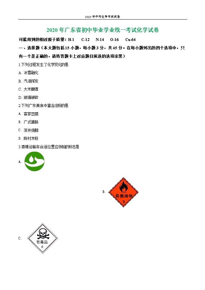【内容简介】一、选择题(本大题包括15小题,每小题3分,共45分。在每小题列出的四个选项中,只有一个是正确的,请将答题卡上对应题目所选的选项涂黑)1.下列过程发生了化学变化的是A. 冰雪融化B. 汽油挥发C. 大米酿酒D. 玻璃破碎2.下列广东美食中富含淀粉的是A. 客家豆腐B. 广式腊肠C. 深井烧鹅D. 陈村米粉3.酒精运输车合适位置应张贴的标志是4.下列物质属于空气污染物的是A. 氧气B. 氮气C. 水蒸气D. 二氧化硫5.Na2CO3俗称纯碱,侯德榜为纯碱工业的发展做出了杰出贡献。Na2CO3属于A 氧化物B. 盐C. 有机物D. 混合物6.公园里能闻到花香,合理的解释是A. 分子体积变大B. 分子在不断运动C. 分子数目变多D. 分子发生了分解7.合成材料的应用与发展,大大方便了人类的生活。下列物品是用有机合成材料制作的是......
