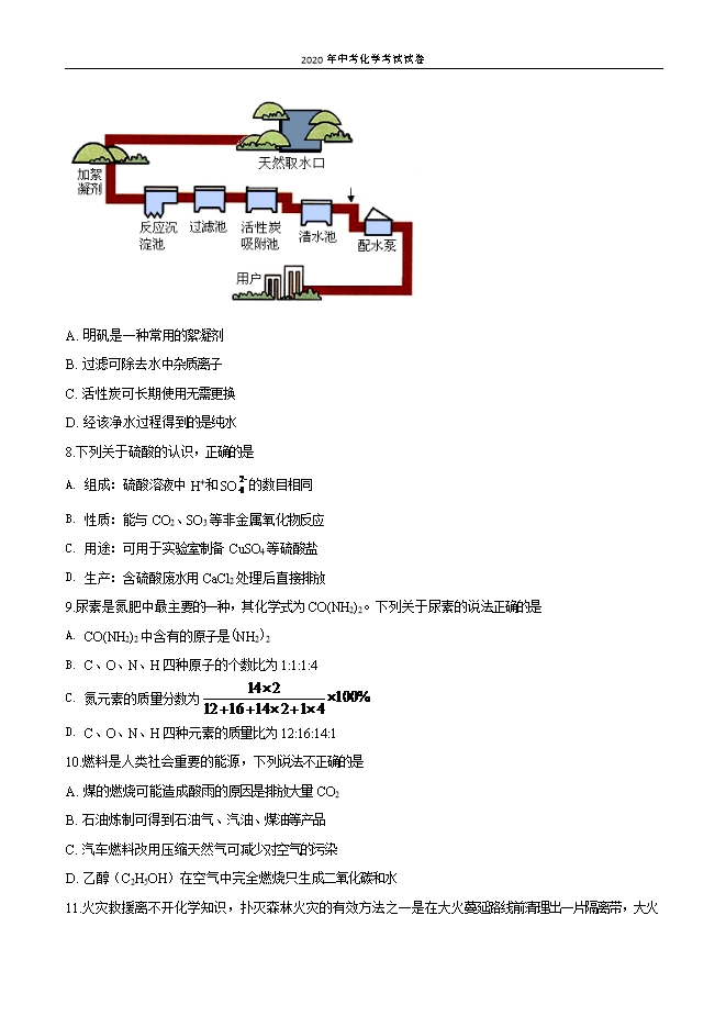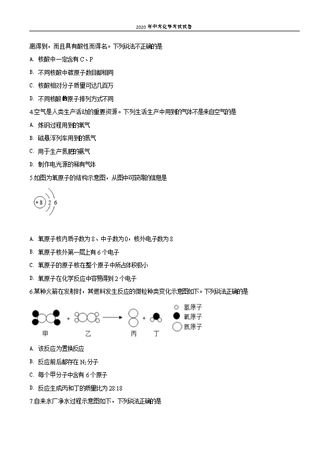 【内容简介】一、选择题(本题包括20小题,每小题2分,共40分)注意:每道选择题有四个选项,其中只有一项符合题意。请用铅笔在答题卡上作答。选错、不选、多选或涂改不清的,均不给分。1.“一日之计在于晨”,新的一天从营养丰富的早餐开始。下列食物富含蛋白质的是A. 玉米、红薯B. 鲜奶、豆浆C. 苹果、西红柿D. 牛油、奶油2.下列我国古代发明或技术中,主要原理不是化学变化的是A. 炭黑制墨B. 粮食酿酒C. 胆矾炼铜D. 燃放烟火3.核酸是一类含磷的生物高分子,属于有机化合物,一般由几千到几十万个原子组成。因最早由细胞核中分离得到,而且具有酸性而得名。下列说法不正确的是A. 核酸中一定含有C、PB. 不同核酸中碳原子数目都相同C. 核酸相对分子质量可达几百万D. 不同核酸 原子排列方式不同4.空气是人类生产活动的重要资源。下列生活生产中用到的气体不是来自空气的是A. 炼钢过程用到的氧气B. 磁悬浮列车用到的氮气C. 用于生产氮肥的氨气D. 制作电光源的稀有气体5.如图为氧原子的结构示意图,从图中可获得的信息是 A. 氧原子核内质子数为8、中子数为0,核外电子数为8B. 氧原子核外第一层上有6个电子C. 氧原子的原子核在整个原子中所占体积极小D. 氧原子在化学反应中容易得到2个电子6.某种火箭在发射时,其燃料发生反应的微粒种类变化示意图如下。下列说法正确的是 A. 该反应为置换反应B. 反应前后都存在N2分子C. 每个甲分子中含有6个原子D. 反应生成丙和丁的质量比为28:187.自来水厂净水过程示意图如下,下列说法正确的是......