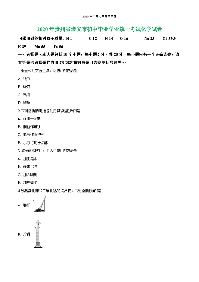 贵州省遵义市2020年初中毕业学业统一考试化学试卷(原卷版)