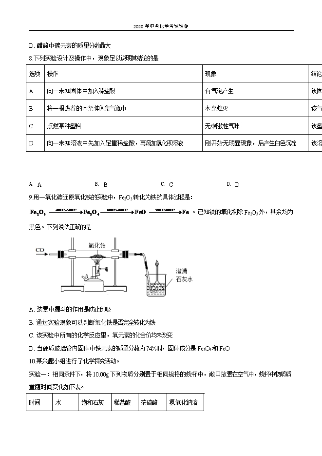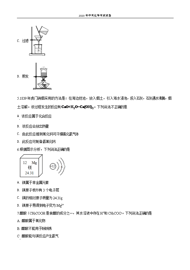 【内容简介】一、选择题(本大题包括10个小题,每小题2分,共20分。每小题只有一个正确答案,请在答题卡选择题栏内用2B铅笔将对应题目答案的标号涂黑。)1.乘坐公共交通工具,可携带的物品是A. 纸巾B. 鞭炮C. 汽油D. 酒精2.下列物质的用途是利用其物理性质的是A. 煤用于发电B. 铜丝作导线C. 氮气作保护气D. 小苏打用于发酵3.欲将硬水软化,生活中常用的方法是A. 加肥皂水B. 静置沉淀C. 加入明矾D. 加热煮沸4.分离氯化钾和二氧化锰的混合物,下列操作正确的是A. 取样 B. 溶解 C. 过滤 D. 蒸发 5.1839年虎门销烟采用的方法是:在海边挖池,放入烟土,引入海水浸泡,投入石灰,石灰遇水沸腾,烟土溶解。该过程发生的反应有 。下列说法不正确的是A 该反应属于化合反应B. 该反应会放出热量C. 由此反应推测氧化钙可干燥氯化氢气体D. 此反应可制备氢氧化钙6.根据图示分析,下列说法正确的是......