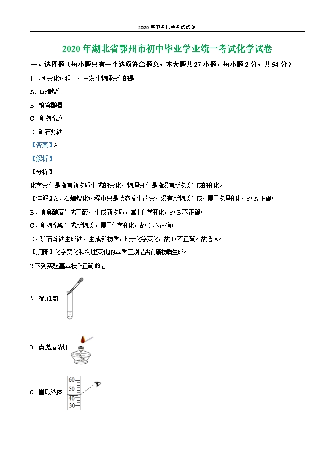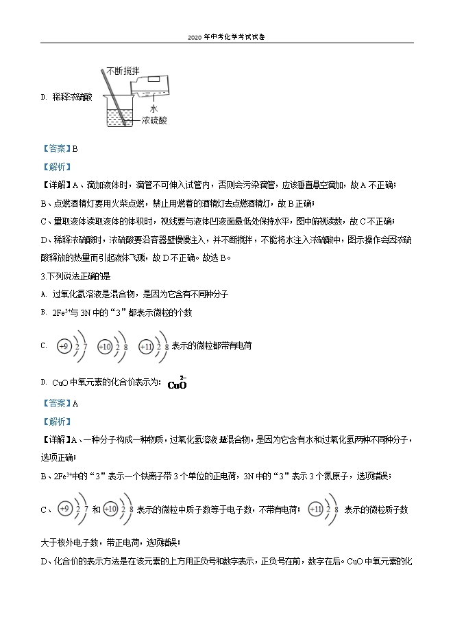 【内容简介】一、选择题(每小题只有一个选项符合题意,本大题共27小题,每小题2分,共54分)1.下列变化过程中,只发生物理变化的是A. 石蜡熔化B. 粮食酿酒C. 食物腐败D. 矿石炼铁【答案】A【解析】【分析】化学变化是指有新物质生成的变化,物理变化是指没有新物质生成的变化。【详解】A、石蜡熔化过程中只是状态发生改变,没有新物质生成,属于物理变化,故A正确;B、粮食酿酒生成乙醇,生成新物质,属于化学变化,故B不正确;C、食物腐败生成新物质,属于化学变化,故C不正确;D、矿石炼铁生成铁,生成新物质,属于化学变化,故D不正确。故选A。【点睛】化学变化和物理变化的本质区别是否有新物质生成。2.下列实验基本操作正确 是A. 滴加液体 B. 点燃酒精灯 C. 量取液体 D. 稀释浓硫酸 【答案】B【解析】【详解】A、滴加液体时,滴管不可伸入试管内,否则会污染滴管,应该垂直悬空滴加,故A不正确;B、点燃酒精灯要用火柴点燃,禁止用燃着的酒精灯去点燃酒精灯,故B正确;C、量取液体读取液体的体积时,视线要与液体凹液面最低处保持水平,图中俯视读数,故C不正确;D、稀释浓硫酸时,浓硫酸要沿容器壁慢慢注入,并不断搅拌,不能将水注入浓硫酸中,图示操作会因浓硫酸释放的热量而引起液体飞溅,故D不正确。故选B。3.下列说法正确的是A. 过氧化氢溶液是混合物,是因为它含有不同种分子B. 2Fe3+与3N中的“3”都表示微粒的个数C. 表示的微粒都带有电荷D. CuO中氧元素的化合价表示为: 【答案】A【解析】【详解】A、一种分子构成一种物质,过氧化氢溶液 混合物,是因为它含有水和过氧化氢两种不同种分子,选项正确;B、2Fe3+中的“3”表示一个铁离子带3个单位的正电荷,3N中的“3”表示3个氮原子,选项错误;C、 和 表示的微粒中质子数等于电子数,不带有电荷; 表示的微粒质子数大于核外电子数,带正电荷,选项错误;D、化合价的表示方法是在该元素的上方用正负号和数字表示,正负号在前,数字在后。CuO中氧元素的化......