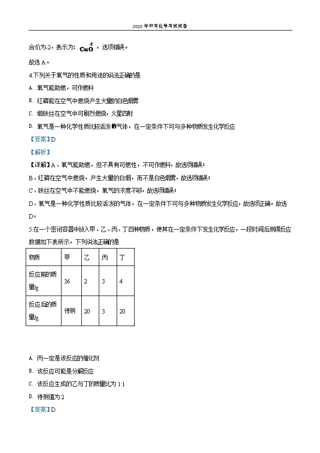 湖北省鄂州市2020年初中毕业学业统一考试化学试卷(解析版)