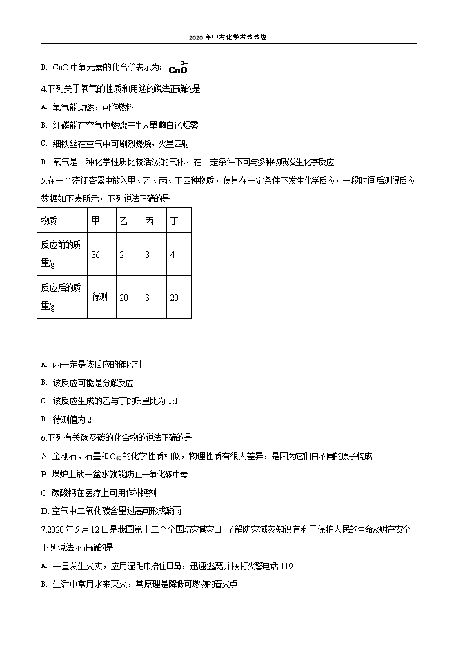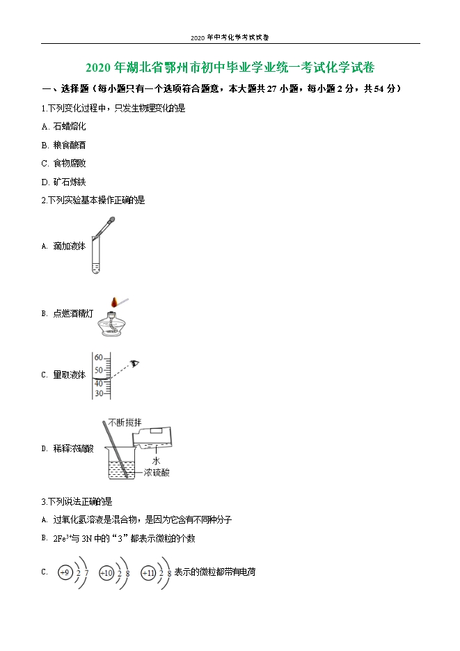 【内容简介】一、选择题(每小题只有一个选项符合题意,本大题共27小题,每小题2分,共54分)1.下列变化过程中,只发生物理变化的是A. 石蜡熔化B. 粮食酿酒C. 食物腐败D. 矿石炼铁2.下列实验基本操作正确的是A. 滴加液体 B. 点燃酒精灯 C. 量取液体 D. 稀释浓硫酸 3.下列说法正确的是A. 过氧化氢溶液是混合物,是因为它含有不同种分子B. 2Fe3+与3N中的“3”都表示微粒的个数C. 表示的微粒都带有电荷D. CuO中氧元素的化合价表示为: 4.下列关于氧气的性质和用途的说法正确的是A. 氧气能助燃,可作燃料B. 红磷能在空气中燃烧产生大量 白色烟雾C. 细铁丝在空气中可剧烈燃烧,火星四射D. 氧气是一种化学性质比较活泼的气体,在一定条件下可与多种物质发生化学反应5.在一个密闭容器中放入甲、乙、丙、丁四种物质,使其在一定条件下发生化学反应,一段时间后测得反应数据如下表所示,下列说法正确的是物质甲乙丙丁反应前的质量/g36234反应后的质量/g待测20320A. 丙一定是该反应的催化剂B. 该反应可能是分解反应C. 该反应生成的乙与丁的质量比为1:1D. 待测值为26.下列有关碳及碳的化合物的说法正确的是A. 金刚石、石墨和C60的化学性质相似,物理性质有很大差异,是因为它们由不同的原子构成B. 煤炉上放一盆水就能防止一氧化碳中毒C. 碳酸钙在医疗上可用作补钙剂D. 空气中二氧化碳含量过高可形成酸雨7.2020年5月12日是我国第十二个全国防灾减灾日。了解防灾减灾知识有利于保护人民的生命及财产安全。下列说法不正确的是A. 一旦发生火灾,应用湿毛巾捂住口鼻,迅速逃离并拨打火警电话119B. 生活中常用水来灭火,其原理是降低可燃物的着火点......