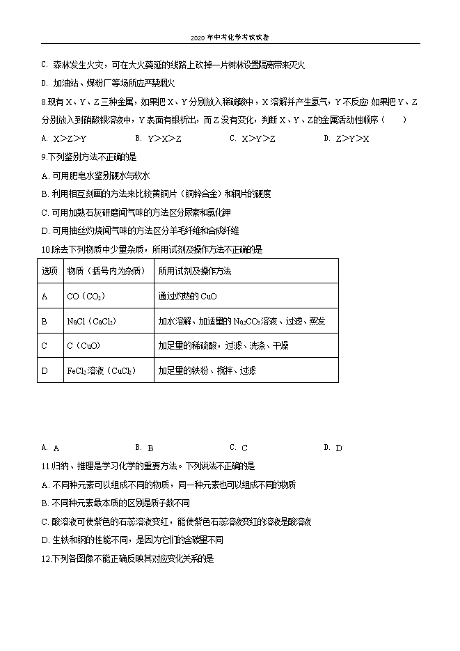 湖北省鄂州市2020年初中毕业学业统一考试化学试卷(原卷版)