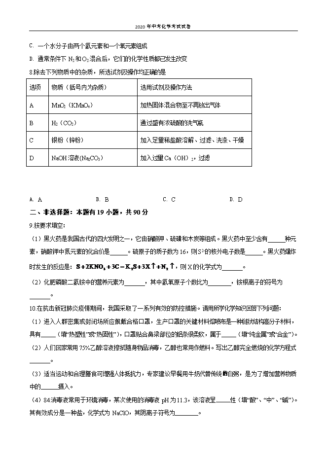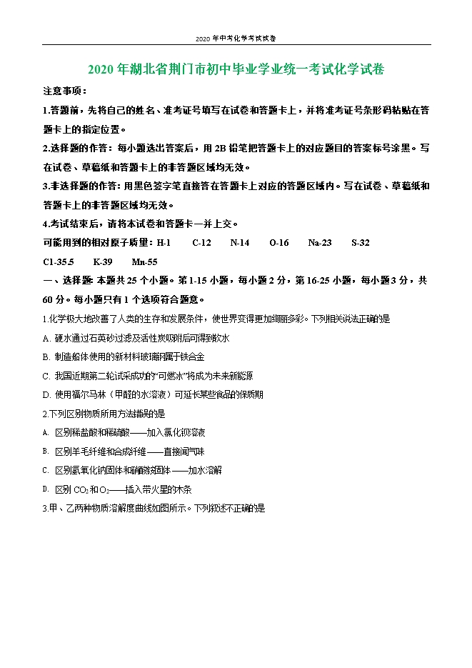 湖北省荆门市2020年初中毕业学业统一考试化学试卷(原卷版)