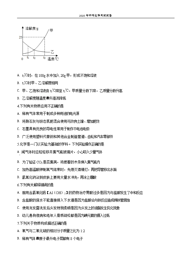 【内容简介】一、选择题:本题共25个小题。笫1-15小题,毎小题2分,第16-25小题,每小题3分,共60分。每小题只有1个选项符合题意。1.化学极大地改善了人类的生存和发展条件,使世界变得更加绚丽多彩。下列相关说法正确的是A. 硬水通过石英砂过滤及活性炭吸附后可得到软水B. 制造船体使用的新材料玻璃钢属于铁合金C. 我国近期第二轮试采成功的“可燃冰”将成为未来新能源D. 使用福尔马林(甲醛的水溶液)可延长某些食品的保质期2.下列区别物质所用方法错误的是A. 区别稀盐酸和稀硫酸——加入氯化钡溶液B. 区别羊毛纤维和合成纤维——直接闻气味C. 区别氢氧化钠固体和硝酸铵固体——加水溶解D. 区别CO2和O2——插入带火星的木条3.甲、乙两种物质溶解度曲线如图所示。下列叙述不正确的是 A. t3℃时,在100g水中加入20g甲,形成不饱和溶液B. t2℃时甲、乙溶解度相同C. 甲、乙饱和溶液由t3℃降至t1℃,甲质量分数下降,乙质量分数升高D. 乙溶解度随温度 升高而降低4.下列有关物质应用不正确的是A. 稀有气体常用于制成多种用途的电光源B. 将熟石灰与铵态氮肥混合使用可改良土壤、增加肥效C. 石墨具有优良的导电性常用于制作干电池电极D. 广泛使用塑料代替钢和其他合金制造管道、齿轮和汽车零部件5.化学是一门以实验为基础的学科。下列实验操作正确的是A 闻气体时应轻轻移开集气瓶玻璃片,小心吸入少量气体B. 为了验证CO2是否集满,将燃着的木条伸入集气瓶内C. 加热高锰酸钾制氧气结束时,先熄灭酒精灯,再把导管移出水面D. 氢氧化钠沾到皮肤上要用大量水冲洗,再涂上硼酸6.下列有关解释错误的是A. 服用含氢氧化铝【Al(OH)3】的药物治疗胃酸过多是因为与盐酸发生了中和反应B. 含盐酸的废水不能直接排入下水道是因为盐酸会与铁反应造成铸铁管腐蚀C. 使用洗发露洗发后头发特别柔顺是因为头发上的油脂发生乳化现象D. 幼儿患佝偻病和老年人骨质疏松都是因为碘元素的摄入过低......