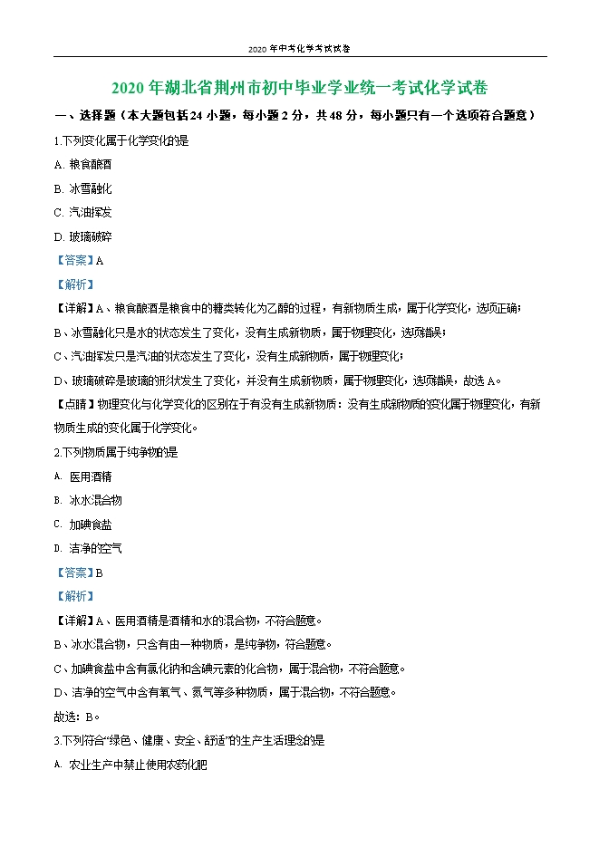 【内容简介】一、选择题(本大题包括24小题,每小题2分,共48分,每小题只有一个选项符合题意)1.下列变化属于化学变化的是A. 粮食酿酒B. 冰雪融化C. 汽油挥发D. 玻璃破碎【答案】A【解析】【详解】A、粮食酿酒是粮食中的糖类转化为乙醇的过程,有新物质生成,属于化学变化,选项正确;B、冰雪融化只是水的状态发生了变化,没有生成新物质,属于物理变化,选项错误;C、汽油挥发只是汽油的状态发生了变化,没有生成新物质,属于物理变化;D、玻璃破碎是玻璃的形状发生了变化,并没有生成新物质,属于物理变化,选项错误,故选A。【点睛】物理变化与化学变化的区别在于有没有生成新物质:没有生成新物质的变化属于物理变化,有新物质生成的变化属于化学变化。2.下列物质属于纯净物的是A. 医用酒精B. 冰水混合物C. 加碘食盐D. 洁净的空气【答案】B【解析】【详解】A、医用酒精是酒精和水的混合物,不符合题意。B、冰水混合物,只含有由一种物质,是纯净物,符合题意。C、加碘食盐中含有氯化钠和含碘元素的化合物,属于混合物,不符合题意。D、洁净的空气中含有氧气、氮气等多种物质,属于混合物,不符合题意。故选:B。3.下列符合“绿色、健康、安全、舒适”的生产生活理念的是A. 农业生产中禁止使用农药化肥......