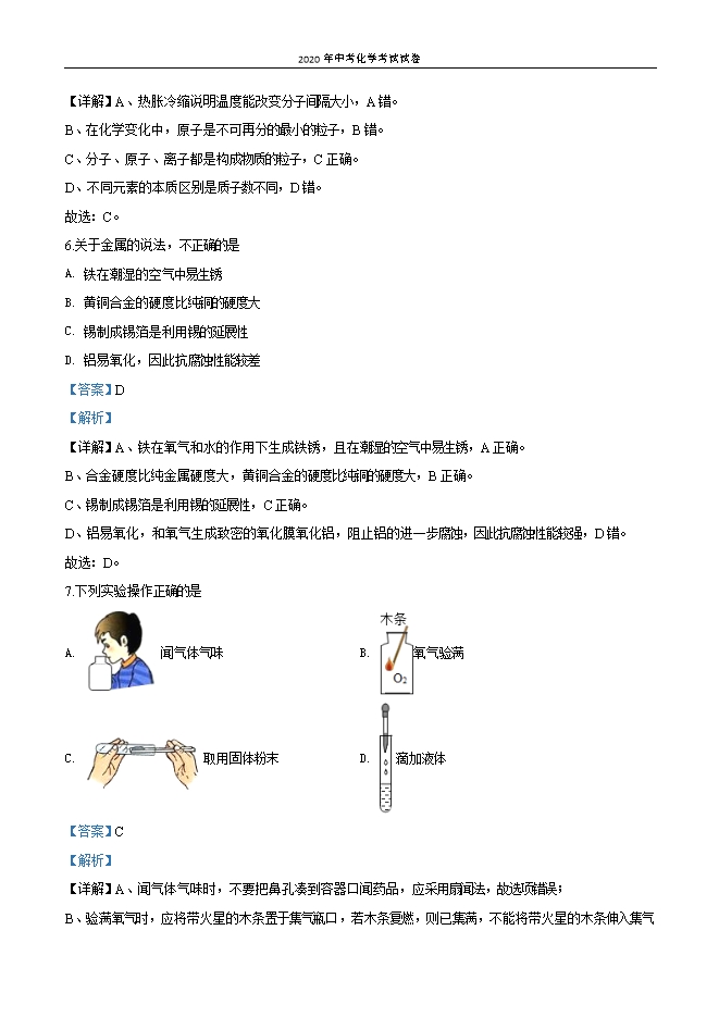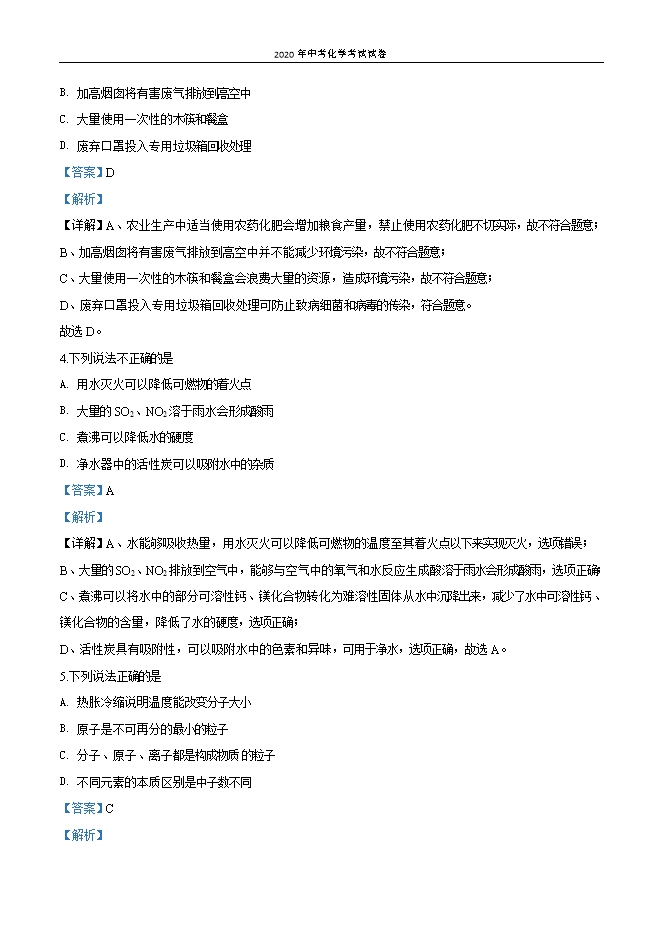 湖北省荆州市2020年初中毕业学业统一考试化学试卷(解析版)