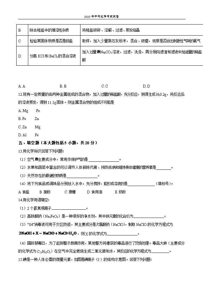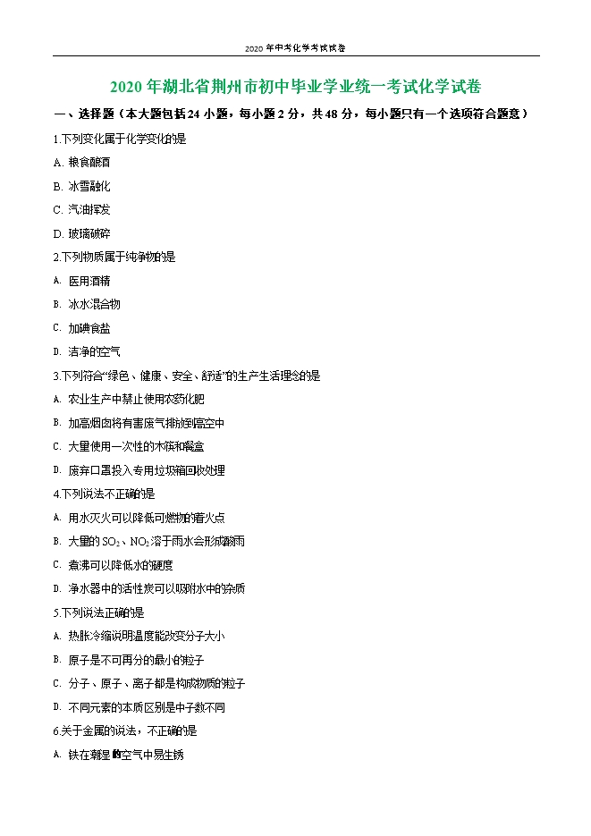 湖北省荆州市2020年初中毕业学业统一考试化学试卷(原卷版)