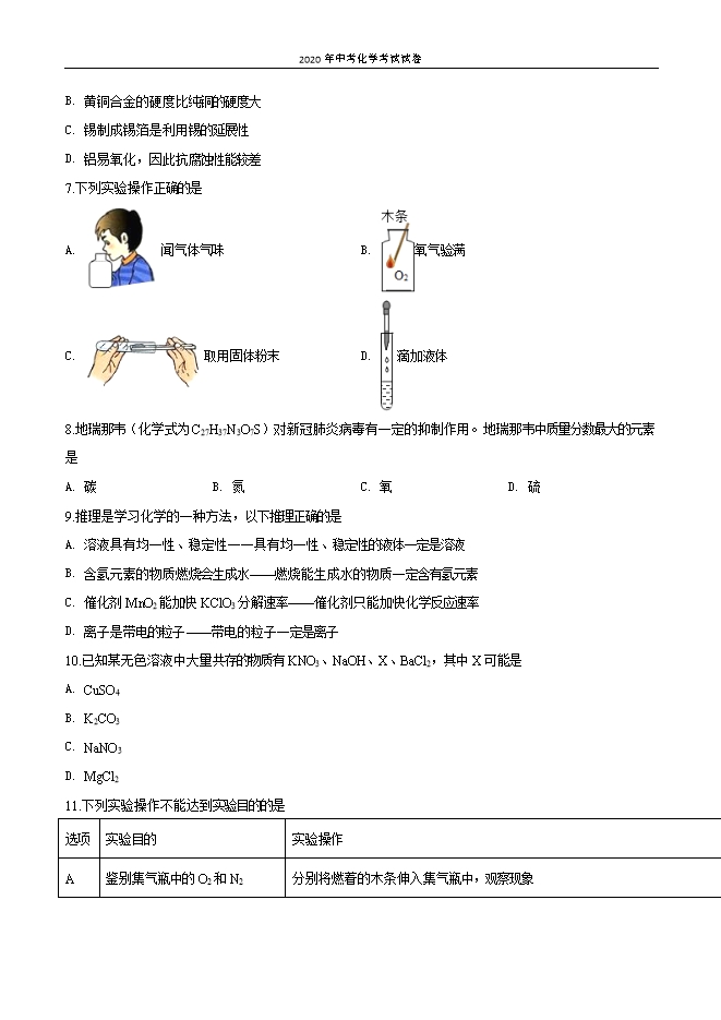 【内容简介】一、选择题(本大题包括24小题,每小题2分,共48分,每小题只有一个选项符合题意)1.下列变化属于化学变化的是A. 粮食酿酒B. 冰雪融化C. 汽油挥发D. 玻璃破碎2.下列物质属于纯净物的是A. 医用酒精B. 冰水混合物C. 加碘食盐D. 洁净的空气3.下列符合“绿色、健康、安全、舒适”的生产生活理念的是A. 农业生产中禁止使用农药化肥B. 加高烟囱将有害废气排放到高空中C. 大量使用一次性的木筷和餐盒D. 废弃口罩投入专用垃圾箱回收处理4.下列说法不正确的是A. 用水灭火可以降低可燃物的着火点B. 大量的SO2、NO2溶于雨水会形成酸雨C. 煮沸可以降低水的硬度D. 净水器中的活性炭可以吸附水中的杂质5.下列说法正确的是A. 热胀冷缩说明温度能改变分子大小B. 原子是不可再分的最小的粒子C. 分子、原子、离子都是构成物质的粒子D. 不同元素的本质区别是中子数不同6.关于金属的说法,不正确的是A. 铁在潮湿 空气中易生锈......