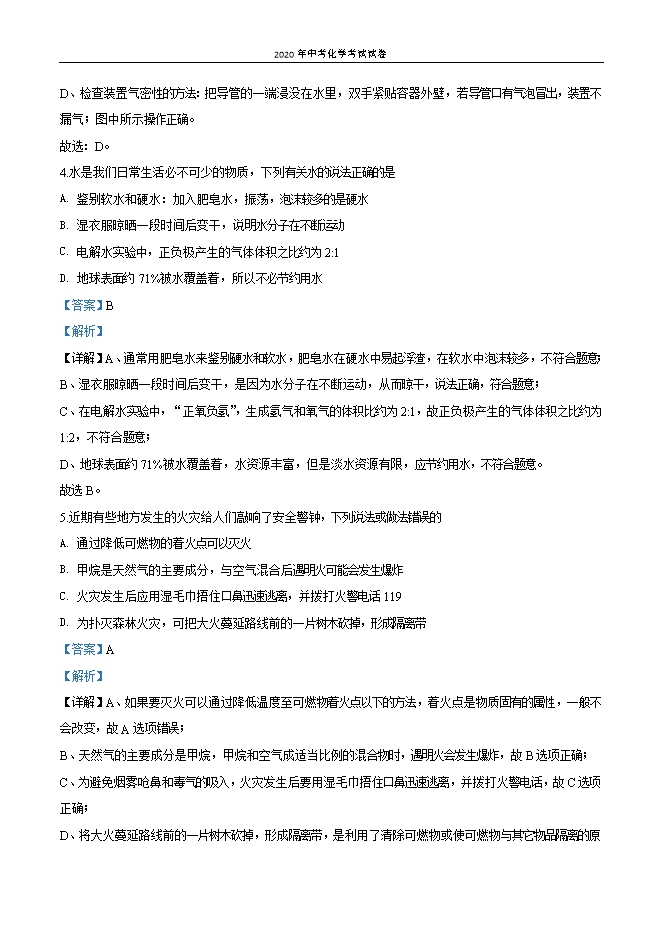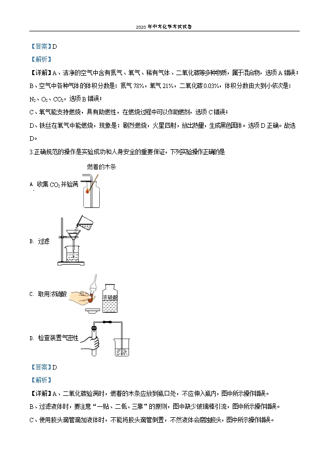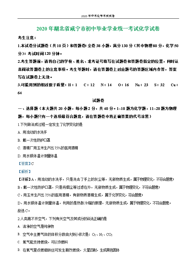 【内容简介】一、选择题(本大题共20小题,每小题2分,共40分。1~10题为化学题,11~20题为物理题,每小题只有一个选项最符合题意,请在答题卷中将正确答業的代号涂黑)1.下列做法或过程一定发生了化学变化的是A. 用流动的水洗手B. 戴一次性防护口罩C. 酒精厂用玉米生产出75%的医用酒精D. 用水银体温计测量体温【答案】C【解析】【详解】A、用流动的水洗手,只是洗去了手上的灰尘等,无新物质生成,属于物理变化,不符合题意;B、戴一次性防护口罩,只是将烟尘等过滤在外,无新物质生成,属于物理变化,不符合题意;C、用玉米生产出75%的医用酒精,有新物质酒精生成,属于化学变化,符合题意;D、用水银体温计测量体温,利用的是热胀冷缩的原理,无新物质生成,属于物理变化,不符合题意。故选C。2.人类离不开空气,下列有关空气及其成分的说法正确的是A. 洁净的空气是纯净物B. 空气中主要气体的体积分数由大到小依次是:O2、N2、CO2C. 氧气能支持燃烧,可以作燃料D. 在氧气里点燃细铁丝可发生剧烈燃烧,火星四射,生成黑色固体【答案】D【解析】【详解】A、洁净的空气中含有氮气、氧气、稀有气体、二氧化碳等多种物质,属于混合物,选项A错误;B、空气中各种气体 体积分数是:氮气78%,氧气21%,二氧化碳0.03%,体积分数由大到小依次是:N2、O2、CO2,选项B错误;C、氧气能支持燃烧,具有助燃性,在燃烧过程中可以作助燃剂,选项C错误;D、铁丝在氧气中能燃烧,现象是:剧烈燃烧,火星四射,放出热量,生成黑色固体。选项D正确。故选D。3.正确规范的操作是实验成功和人身安全的重要保证,下列实验操作正确的是......
