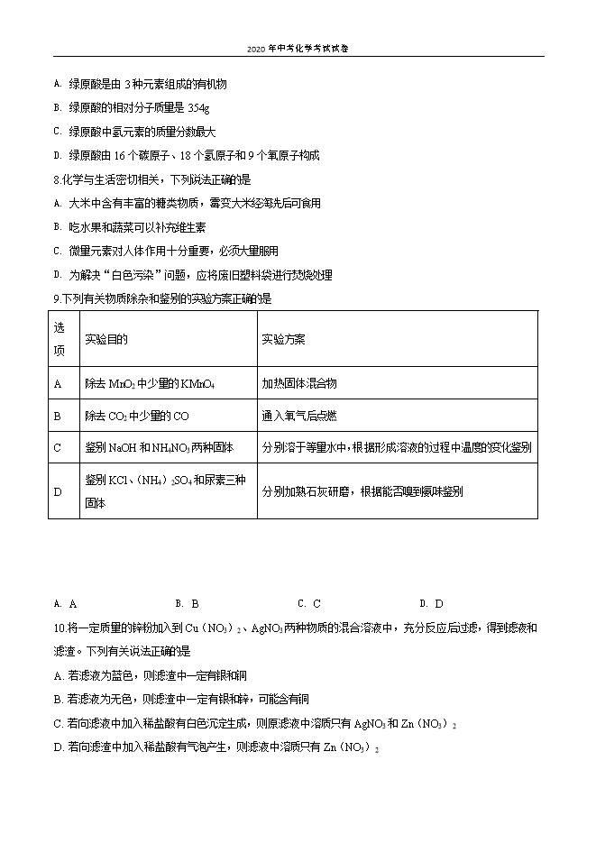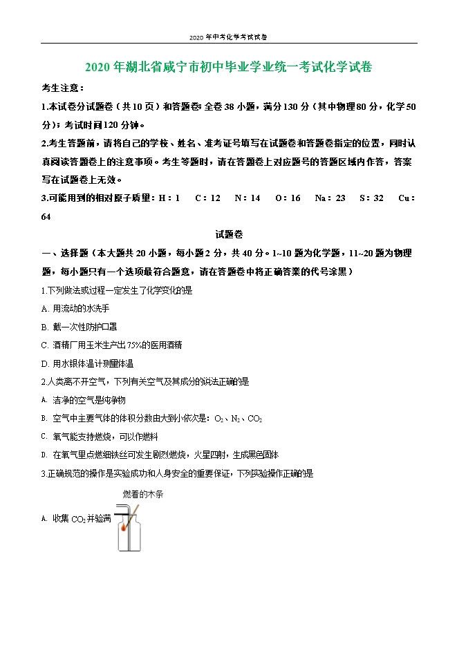 湖北省咸宁市2020年初中毕业学业统一考试化学试卷(原卷版)