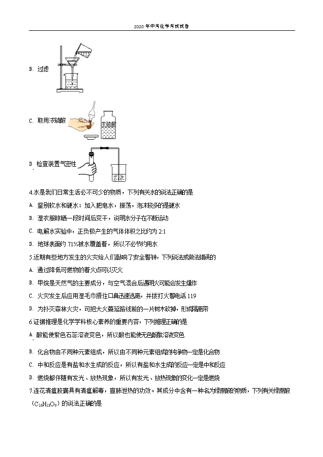 【内容简介】一、选择题(本大题共20小题,每小题2分,共40分。1~10题为化学题,11~20题为物理题,每小题只有一个选项最符合题意,请在答题卷中将正确答業的代号涂黑)1.下列做法或过程一定发生了化学变化的是A. 用流动的水洗手B. 戴一次性防护口罩C. 酒精厂用玉米生产出75%的医用酒精D. 用水银体温计测量体温2.人类离不开空气,下列有关空气及其成分的说法正确的是A. 洁净的空气是纯净物B. 空气中主要气体的体积分数由大到小依次是:O2、N2、CO2C. 氧气能支持燃烧,可以作燃料D. 在氧气里点燃细铁丝可发生剧烈燃烧,火星四射,生成黑色固体3.正确规范的操作是实验成功和人身安全的重要保证,下列实验操作正确的是A. 收集CO2并验满 B. 过滤 C. 取用浓硫酸 D 检查装置气密性 4.水是我们日常生活必不可少的物质,下列有关水的说法正确的是A. 鉴别软水和硬水:加入肥皂水,振荡,泡沫较多的是硬水B. 湿衣服晾晒一段时间后变干,说明水分子在不断运动C. 电解水实验中,正负极产生的气体体积之比约为2:1D. 地球表面约71%被水覆盖着,所以不必节约用水5.近期有些地方发生的火灾给人们敲响了安全警钟,下列说法或做法错误的A. 通过降低可燃物的着火点可以灭火B. 甲烷是天然气的主要成分,与空气混合后遇明火可能会发生爆炸C. 火灾发生后应用湿毛巾捂住口鼻迅速逃离,并拨打火警电话119D. 为扑灭森林火灾,可把大火蔓延路线前的一片树木砍掉,形成隔离带6.证据推理是化学学科核心素养的重要内容,下列推理正确的是A 酸能使紫色石蕊溶液变色,所以酸也能使无色酚酞溶液变色......