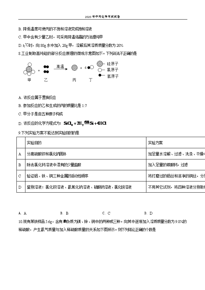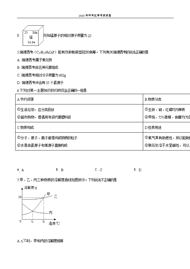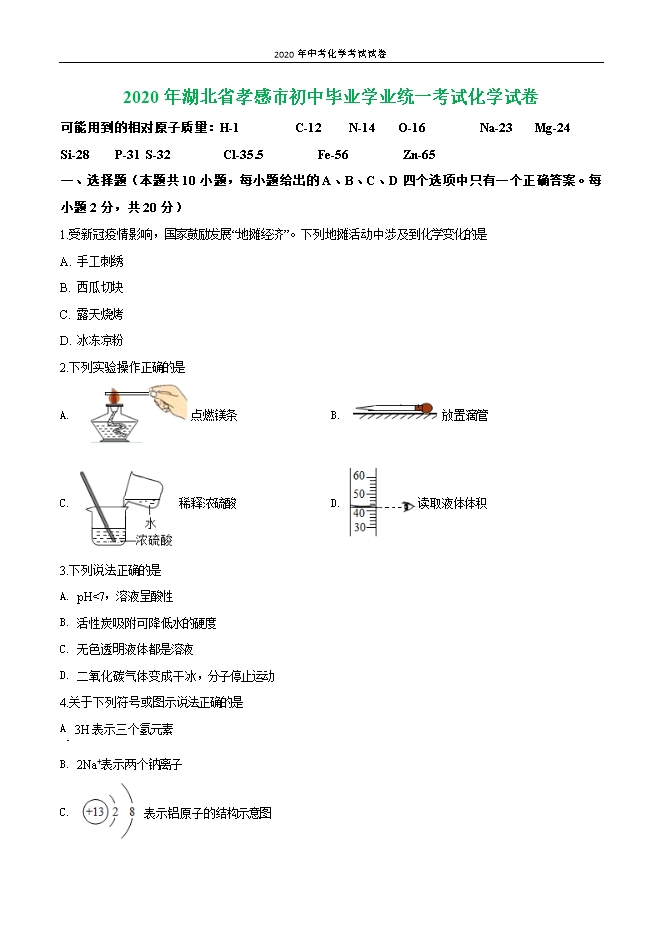 【内容简介】一、选择题(本题共10小题,每小题给出的A、B、C、D四个选项中只有一个正确答案。每小题2分,共20分)1.受新冠疫情影响,国家鼓励发展“地摊经济”。下列地摊活动中涉及到化学变化的是A. 手工刺绣B. 西瓜切块C. 露天烧烤D. 冰冻凉粉2.下列实验操作正确的是A. 点燃镁条B 放置滴管C. 稀释浓硫酸D. 读取液体体积3.下列说法正确的是A.;7,溶液呈酸性B. 活性炭吸附可降低水的硬度C. 无色透明液体都是溶液D. 二氧化碳气体变成干冰,分子停止运动4.关于下列符号或图示说法正确的是A 3H表示三个氢元素B. 2Na+表示两个钠离子C. 表示铝原子的结构示意图D. 可知锰原子的相对原子质量为255.瑞德西韦(C27H35N6O8P)能有效抑制新型冠状病毒。下列有关瑞德西韦的说法正确的是A. 瑞德西韦属于氧化物B. 瑞德西韦由五种元素组成C. 瑞德西韦相对分子质量为602gD. 瑞德西韦中含有35个氢原子6.下列对某一主题知识的归纳完全正确的一组是A.节约资源B.物质分类①生活垃圾,应分类投放②超市购物,提倡用布袋代替塑料袋①生铁、硫、红磷均为单质②甲烷、75%酒精、食醋均为混合物C.物质构成D.性质用途①分子、原子、离子都是构成物质的粒子②水是由氢原子和氧原子直接构成①氧气具有助燃性,所以能做燃料②熟石灰溶于水呈碱性,可以用来改良酸性土壤......