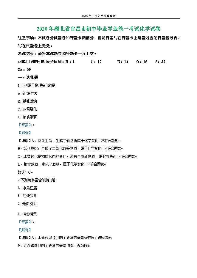 湖北省宜昌市2020年初中毕业学业统一考试化学试卷(解析版)